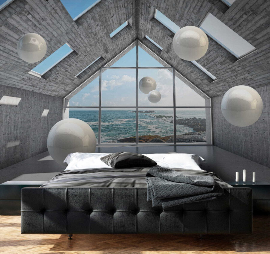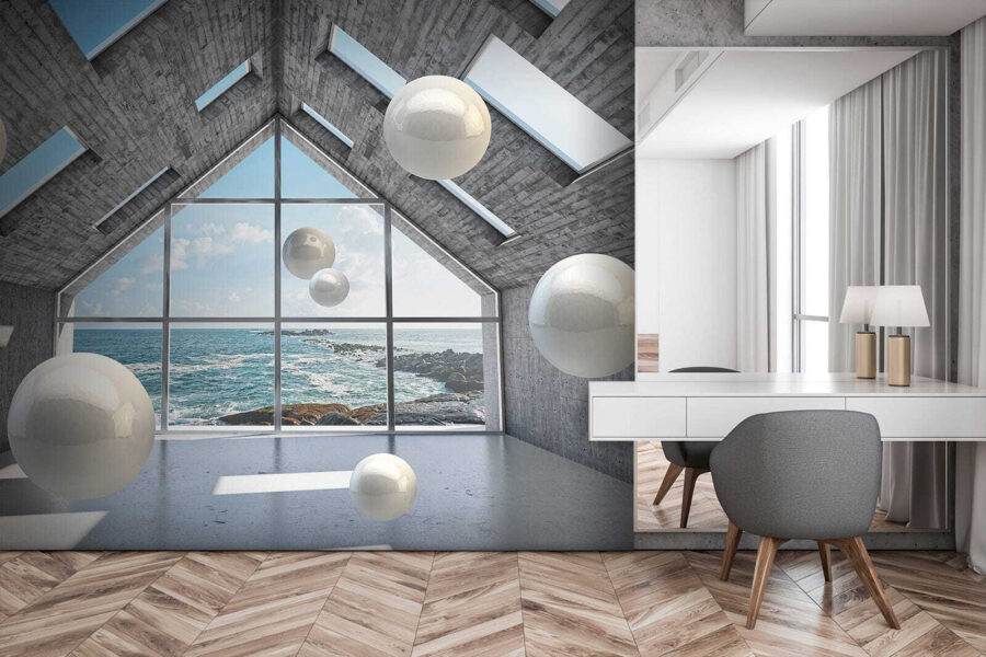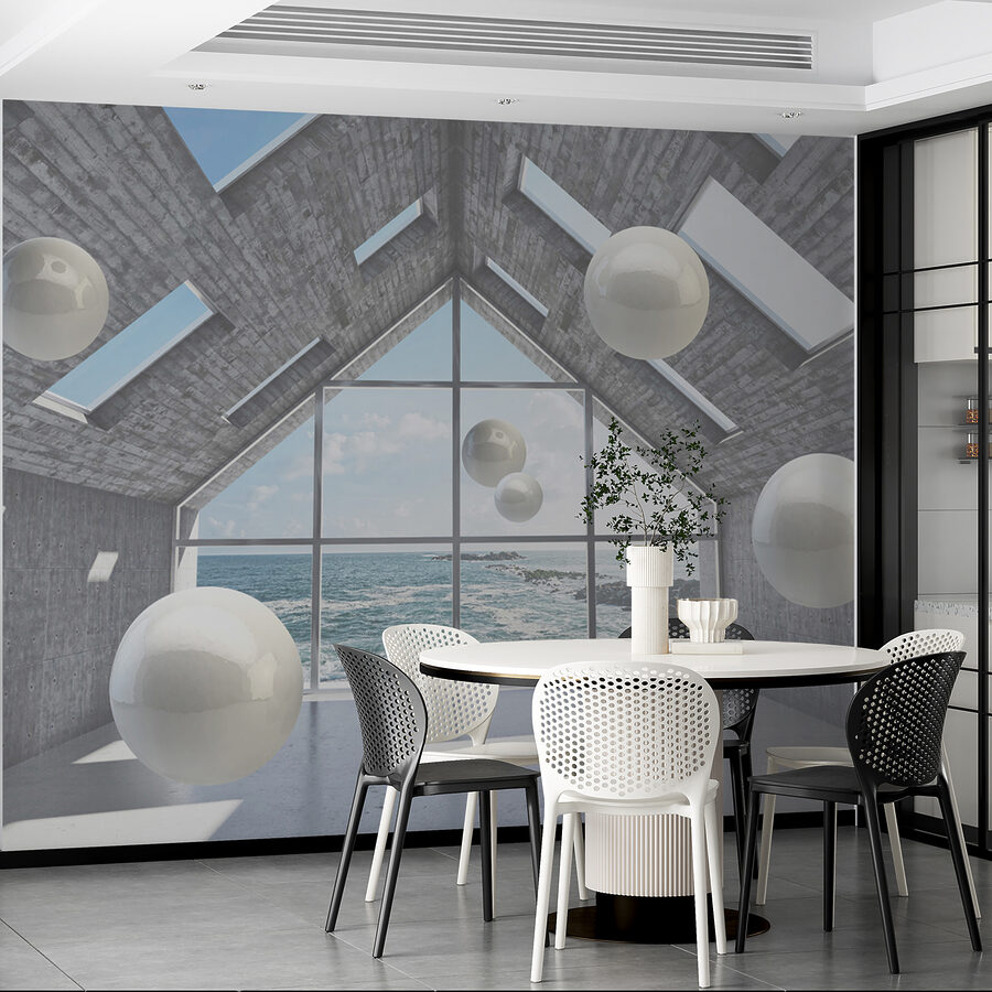 Transformați-vă spațiul într-o evadare de vis cu această pictură murală a unei sfere albe care plutește într-o cameră de beton. Este ca și cum ai păși într-o instalație de artă fără să părăsești confortul de acasă. Imaginați-vă sorbind cafea, pierdut în gânduri, în timp ce acele sfere elegante par să danseze în jurul dvs. Îmbinarea aspectului modern, industrial, cu priveliștea fascinantă a mării creează o atmosferă răcoroasă. Este perfectă pentru a stârni creativitatea sau doar pentru a lua un moment de respiro. Fie că este într-o cameră de zi confortabilă sau într-un birou șic, această pictură murală invită la curiozitate și conversație, făcând ca orice perete să se simtă viu. Simțiți vibrația!