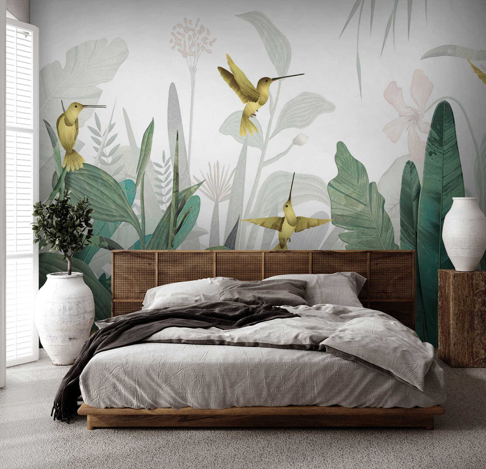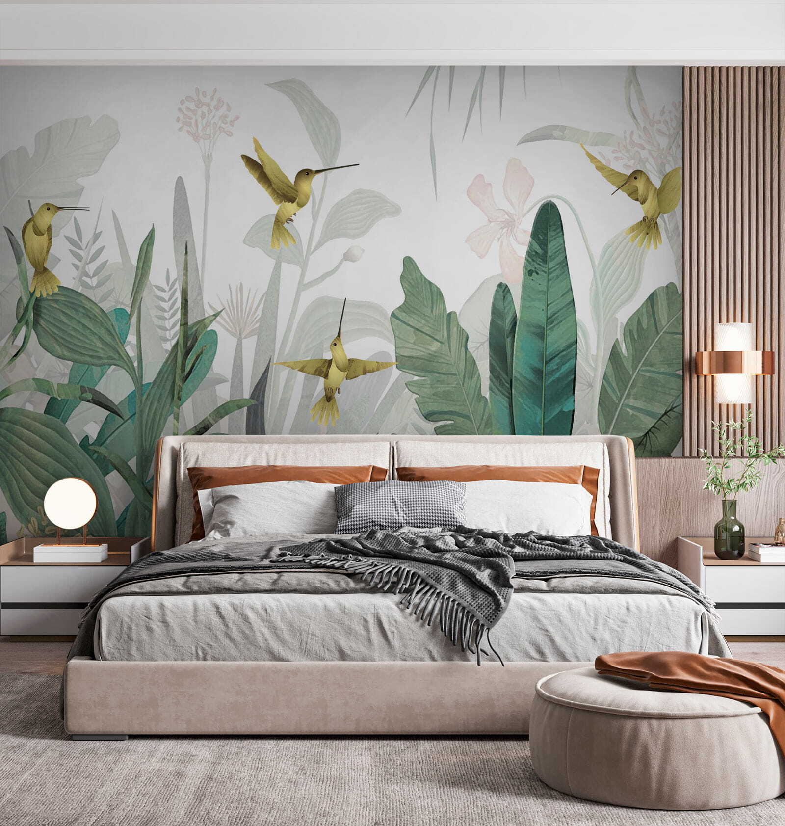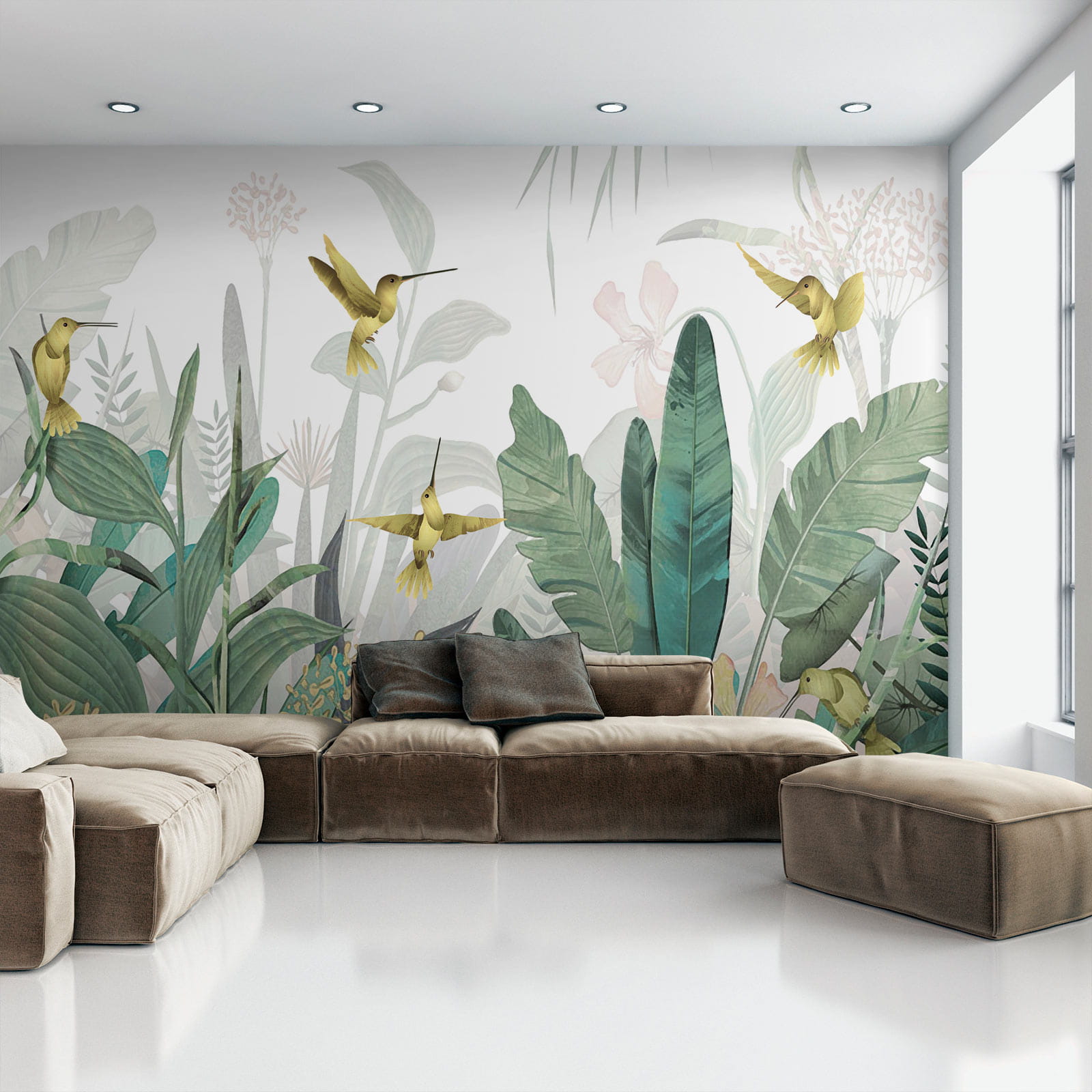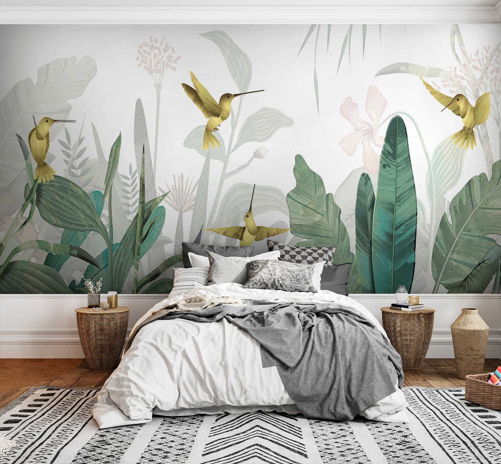 Imaginați-vă că intrați într-o cameră și simțiți că ați pășit într-un paradis luxuriant din junglă – colibri zburând în jur, frunziș vibrant în jurul dumneavoastră. Acesta este efectul acestei picturi murale “Hummingbirds Flutter Amid Lush Foliage” asupra unui spațiu. Este ca o mică felie de paradis tropical chiar pe peretele tău!