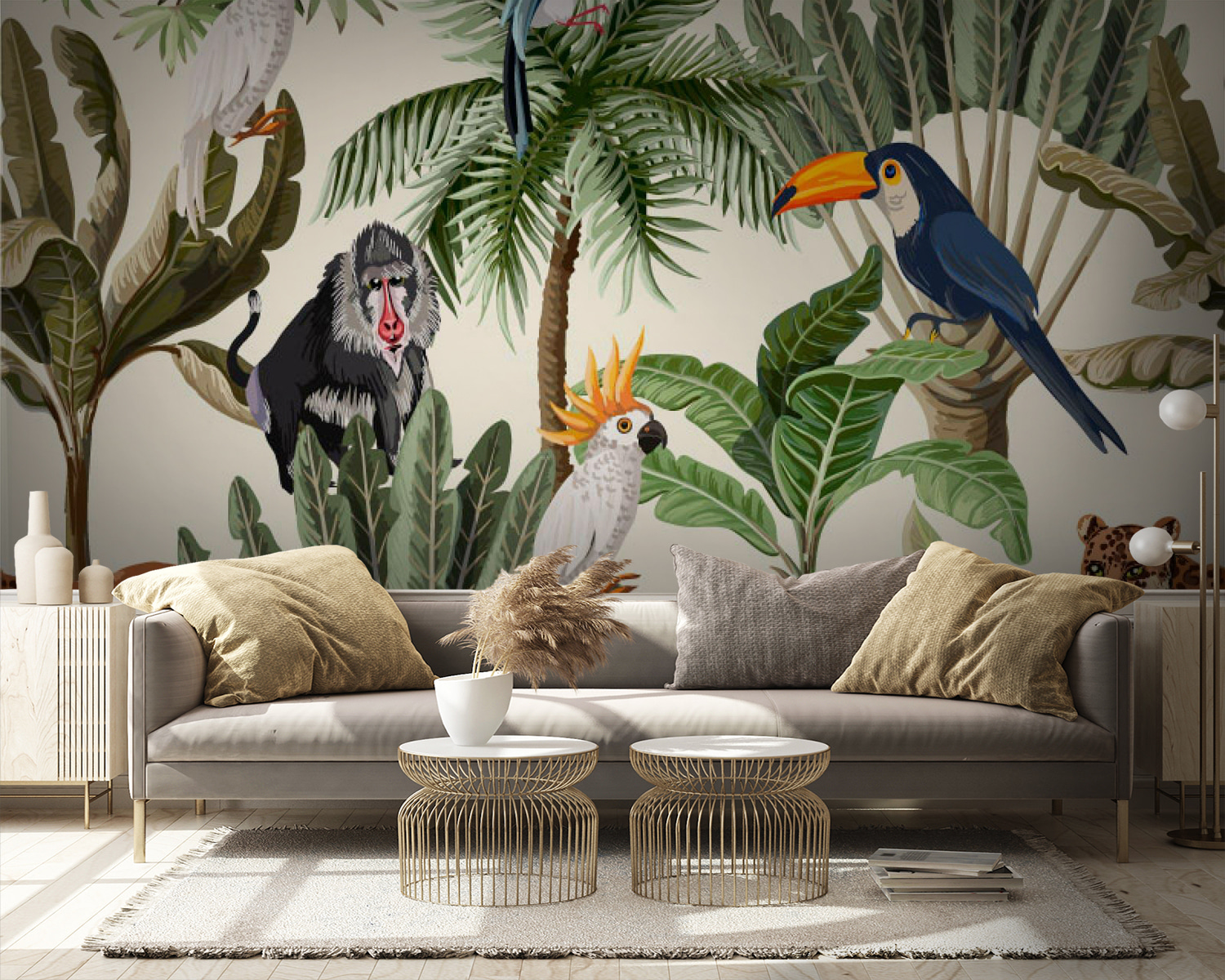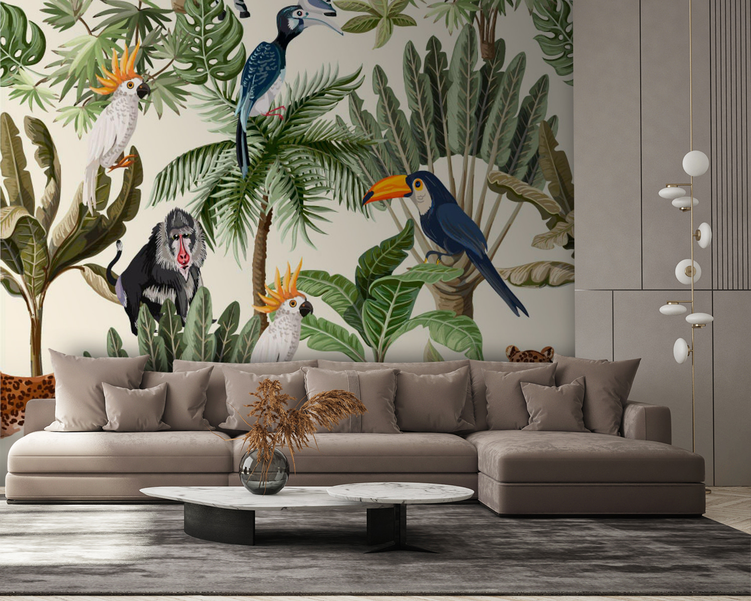Transformați orice cameră într-un paradis tropical cu această pictură murală vibrantă cu plante fermecătoare și păsări exotice, perfectă pentru cei care tânjesc după un strop de culoare! Imaginați-vă că intrați în spațiul dvs. și vă simțiți ca și cum ați fi fost dus într-o junglă luxuriantă. Combinațiile jucăușe de papagali, leoparzi și alte creaturi pline de viață invită la un sentiment de aventură. Este ca și cum ai aduce o bucățică de natură în interior – fără insecte! Ideală pentru o cameră de copil, cameră de zi sau oriunde ar fi nevoie de un pic de veselie, această pictură murală este o sursă încântătoare de conversație. Este irezistibilă!