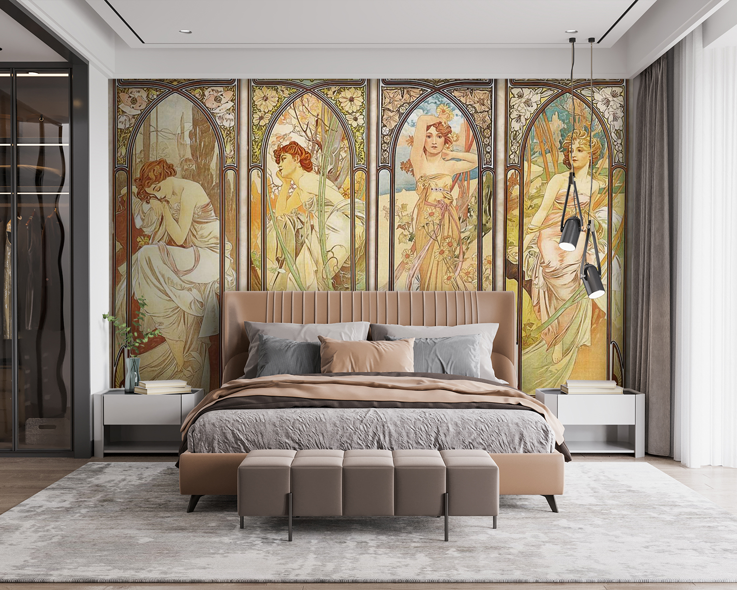 Transformați-vă spațiul cu acest fototapet încântător, care prezintă un grup fermecător de femei în stil art nouveau. Imaginați-vă că vă treziți și simțiți că ați pășit într-un vis capricios, în care liniile fluide și culorile vibrante dansează pe pereții dvs. Fiecare femeie spune o poveste, pierdută în gânduri sau celebrând natura. Este ca și cum te-ar invita în lumea lor, chiar din momentul în care intri. Perfect pentru un colț confortabil de lectură sau un element central artistic, acest mural te atrage, făcându-te să simți că arta este vie. În plus, cui nu i-ar plăcea o doză zilnică de frumusețe? Poate adaugi un scaun confortabil, o carte bună și savurezi pur și simplu acea atmosferă magică. Crede-mă, va transforma orice cameră într-un mic sanctuar.