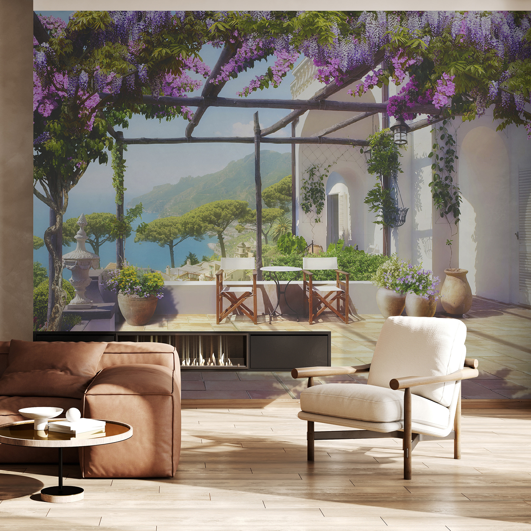 Perfectă pentru a înveseli orice spațiu, această pictură murală îmbină arhitectura clasică cu frumusețea naturii. Aproape că veți auzi foșnetul blând al frunzelor și veți simți o briză caldă. Fie că este vorba de camera de zi sau de un colț confortabil de cafenea, această pictură murală aduce o atmosferă primitoare și senină… aproape ca și cum v-ați fi mutat în locul dvs. preferat de pe coastă. Ghivecele de teracotă, pline de flori colorate, adaugă acea notă perfectă de farmec.