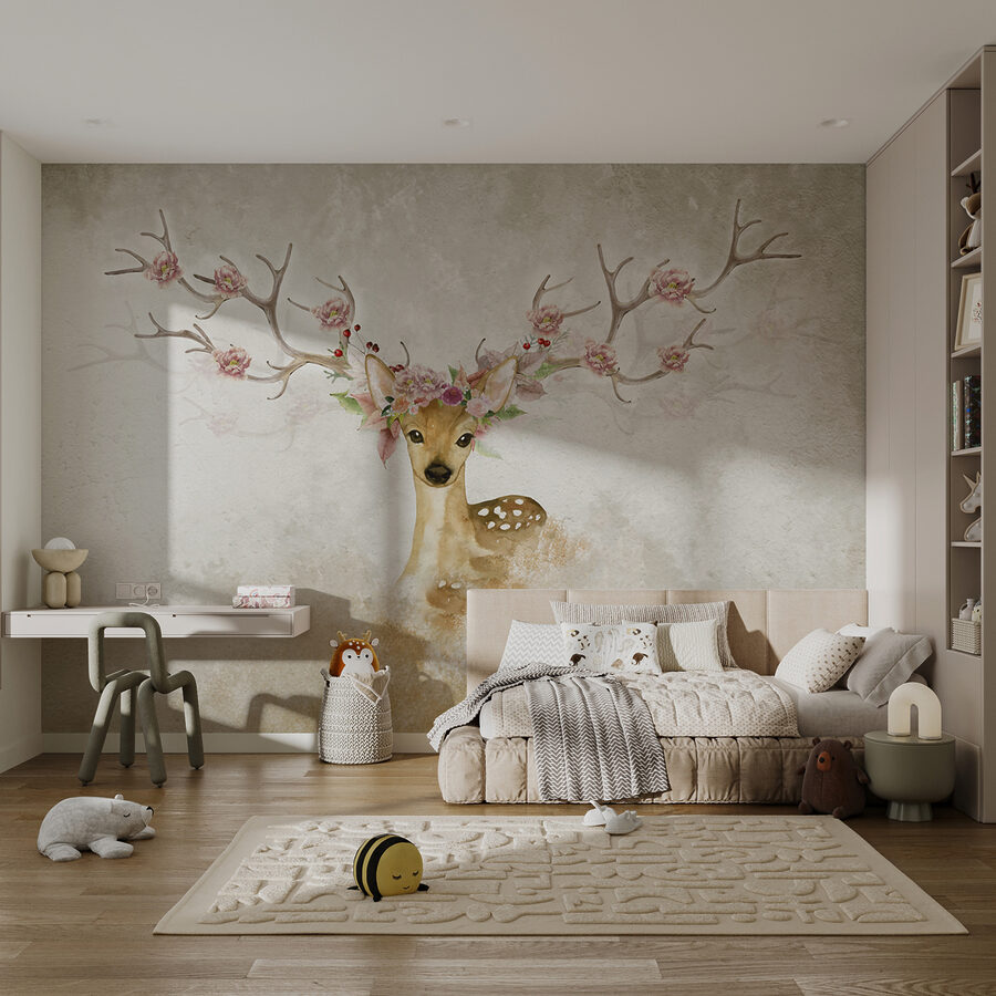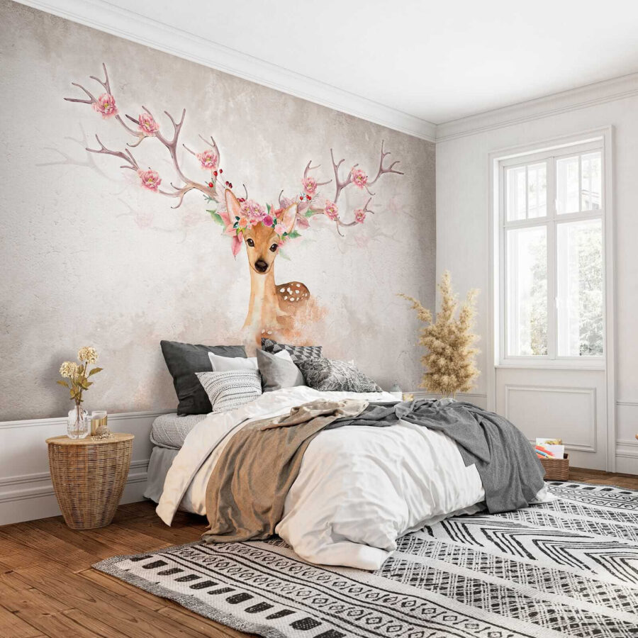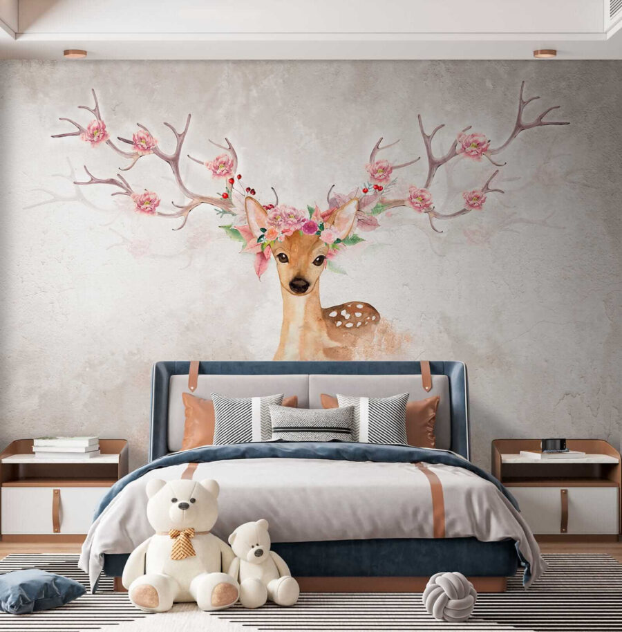 Imaginați-vă că intrați într-o cameră și sunteți întâmpinați de această pictură murală încântătoare în acuarelă a unei căprioare cu flori pe cap. Nu-i așa că este adorabilă? Perfectă pentru camera unui copil sau pentru un loc confortabil care cere doar o notă de fantezie! Are acest amestec minunat de tonuri pământii și pasteluri delicate care pare… ei bine, magic. Imaginați-vă-l pe micuțul dvs. visând sub ochiul vigilent al acestei creaturi blânde. Sau înveselește-ți spațiul de zi cu zi cu această operă de artă moale și fermecătoare – zâmbete garantate și pentru oaspeți! În plus, florile de pe coarne sunt pur și simplu prea drăguțe, nu credeți? Este ca un basm care a prins viață pe peretele tău. Inspirați creativitatea și lăsați vibrațiile de vis să curgă…