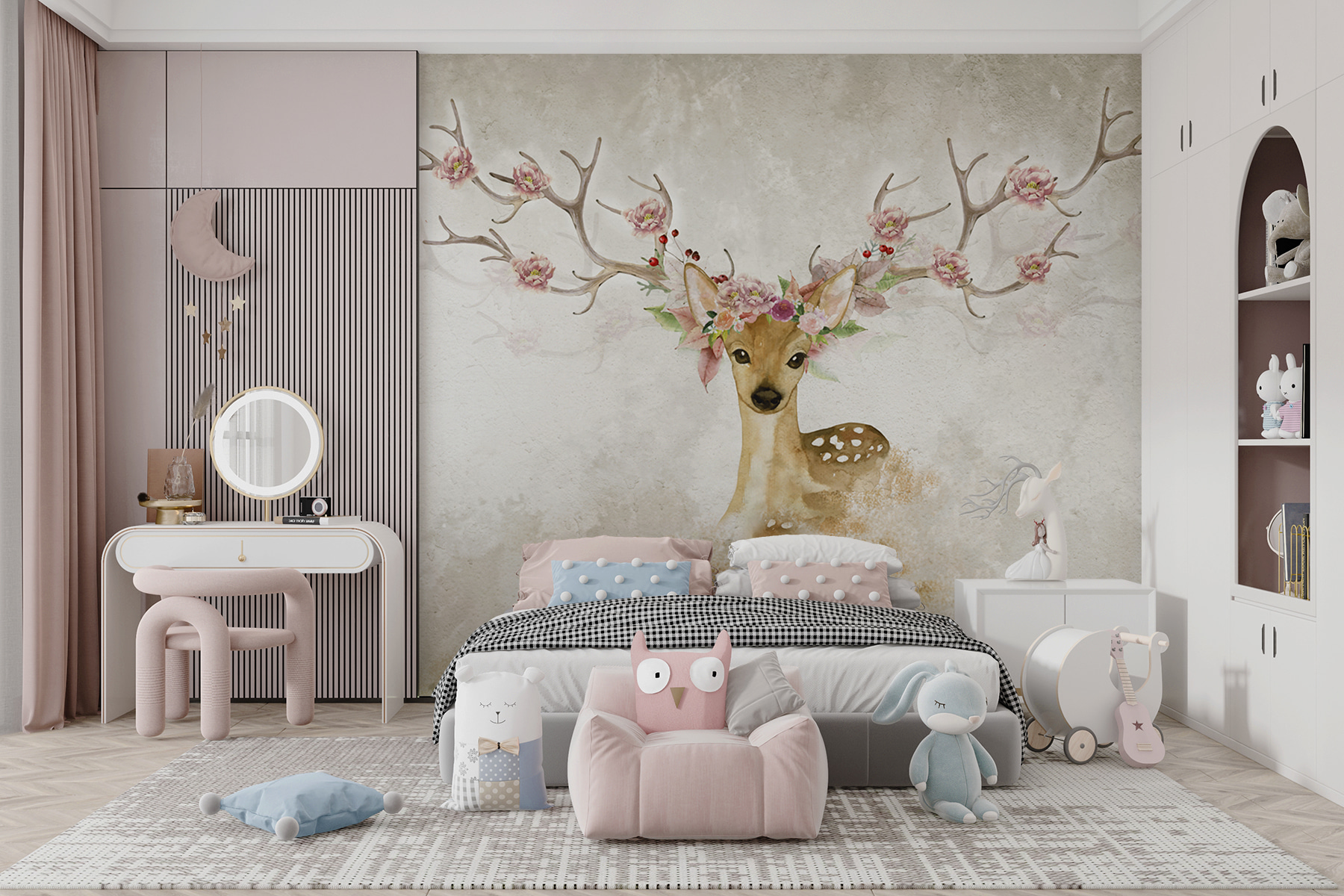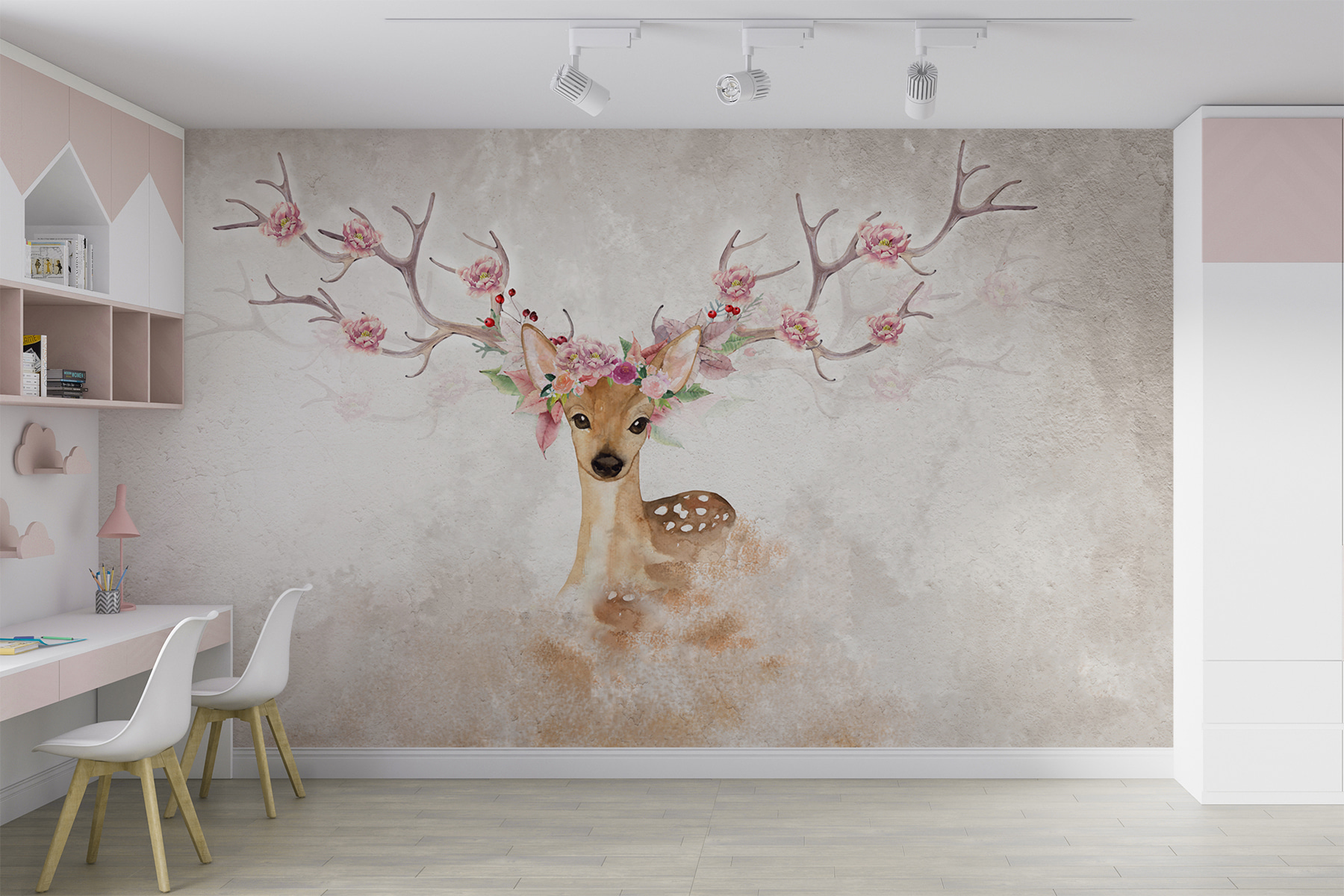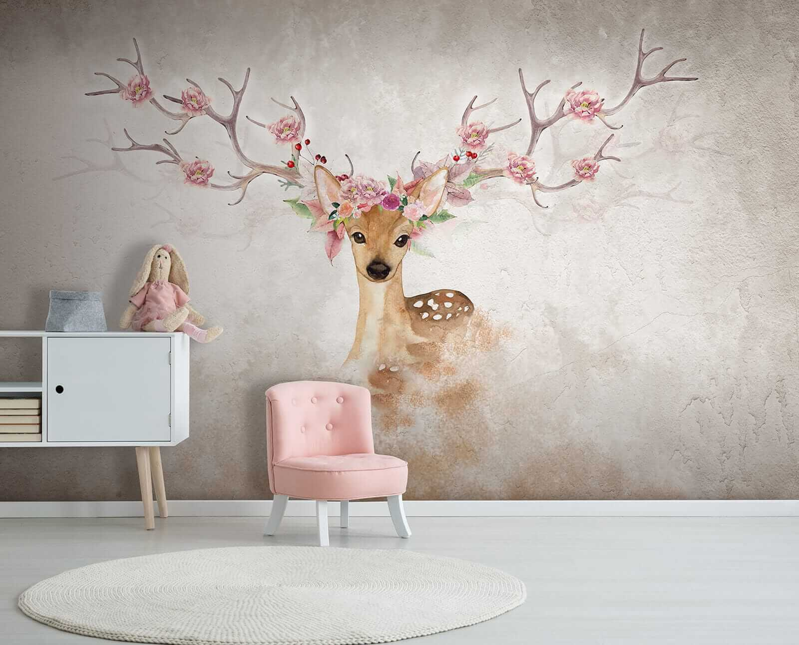 Imaginați-vă că intrați într-o cameră și sunteți întâmpinați de această pictură murală încântătoare în acuarelă a unei căprioare cu flori pe cap. Nu-i așa că este adorabilă? Perfectă pentru camera unui copil sau pentru un loc confortabil care cere doar o notă de fantezie! Are acest amestec minunat de tonuri pământii și pasteluri delicate care pare… ei bine, magic. Imaginați-vă-l pe micuțul dvs. visând sub ochiul vigilent al acestei creaturi blânde. Sau înveselește-ți spațiul de zi cu zi cu această operă de artă moale și fermecătoare – zâmbete garantate și pentru oaspeți! În plus, florile de pe coarne sunt pur și simplu prea drăguțe, nu credeți? Este ca un basm care a prins viață pe peretele tău. Inspirați creativitatea și lăsați vibrațiile de vis să curgă…