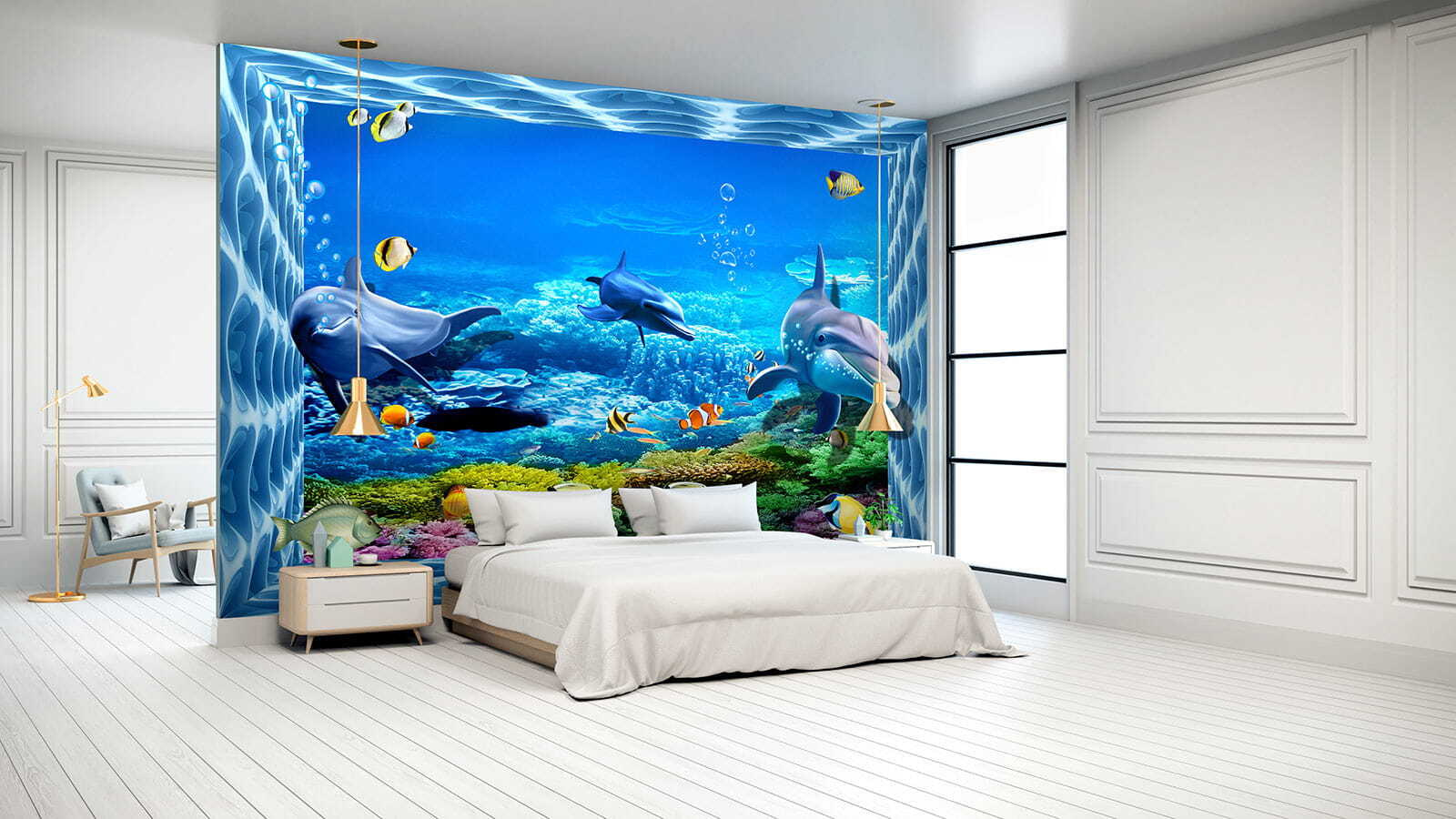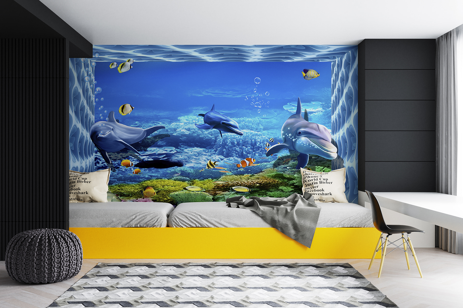 Scufundați-vă într-o lume subacvatică vibrantă cu această pictură murală încântătoare cu delfini care înoată grațios prin ape strălucitoare. Imaginați-vă că vă holbați la aceste creaturi jucăușe, înconjurate de pești colorați și corali luxurianți – este ca și cum ați aduce o felie de paradis oceanic chiar în camera dvs. Perfectă pentru spațiile pentru copii sau pentru oricine este un copil la suflet, această pictură murală stârnește bucurie și curiozitate. Imaginați-vă doar zâmbetele pe care le va aduce în timpul după-amiezelor leneșe sau al întâlnirilor de joacă pline de viață. Nu este doar decor; este o aventură care așteaptă să se întâmple. Cine nu s-ar simți un pic mai vesel privind această scenă stropitoare? Decorați-vă pereții și lăsați distracția să curgă!