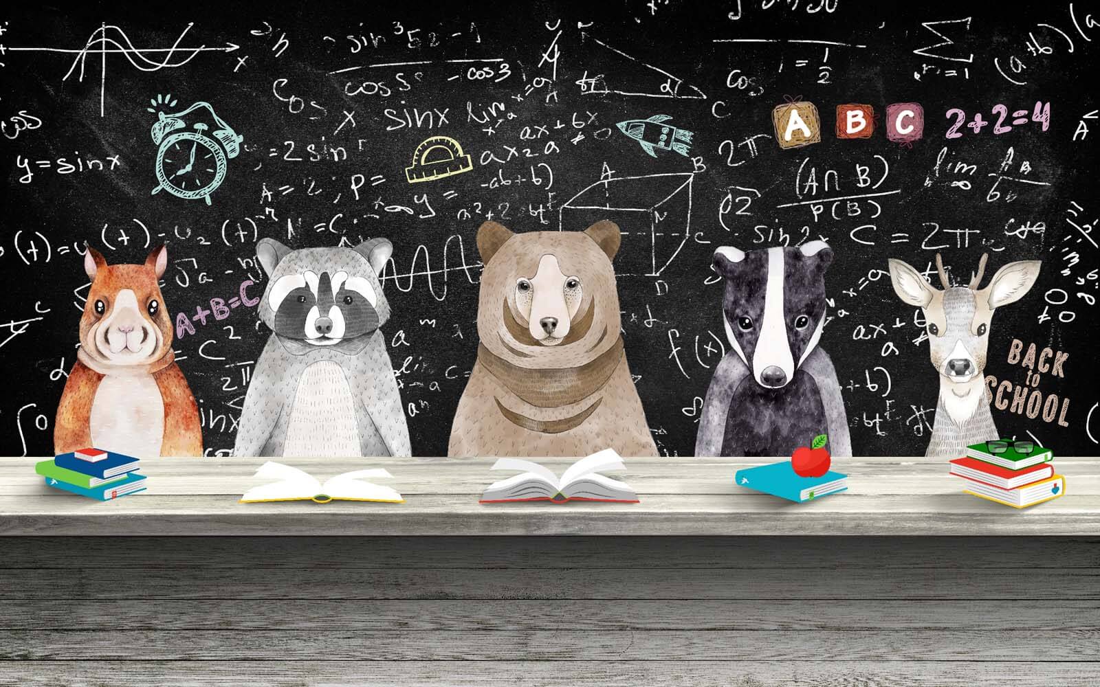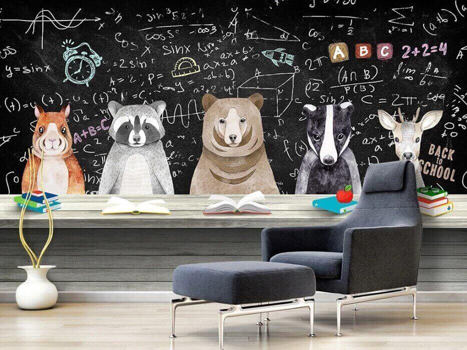 Intrați într-o sală de clasă capricioasă, unde natura și învățarea se întâlnesc! Acest mural fermecător, cu adorabili elevi animale – gândiți-vă la ratoni, urși și un cerb bătrân și înțelept – se află pe fundalul unei table pline cu ecuații și litere jucăușe. Este ca o atmosferă distractivă de revenire la școală în fiecare zi, perfectă pentru camera unui copil sau pentru un spațiu de lucru creativ. Imaginați-vă râsetele copiilor care încearcă să învețe alături de prietenii lor blănoși. Culorile delicate și tema veselă aduc căldură, făcându-vă să vă simțiți ca acasă. În plus, cine nu și-ar dori un urs care să le supravegheze temele? Este atât educativ, cât și super drăguț, adăugând un strop de bucurie oricărui perete!