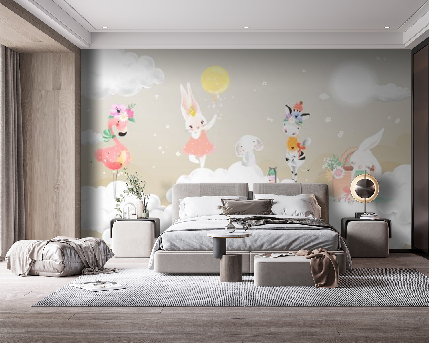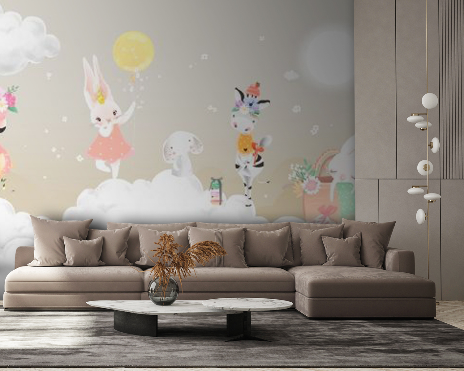 Transformați un perete plictisitor într-un paradis de vis cu această pictură murală încântătoare cu un grup de animale capricioase care se zbenguie pe nori pufoși. Imaginați-vă: un flamingo jucăuș, un iepuraș fermecător într-o rochie roz și o zebră cu o pălăriuță – se relaxează pe cer ca și cum locul le-ar aparține. Această pictură murală aduce o atmosferă caldă și veselă care poate stârni bucurie în orice cameră, de la o cameră pentru copii plină de viață la un colț de lectură confortabil. Se simte ca o îmbrățișare pentru pereți, învăluind spațiile într-un sentiment de uimire și imaginație. Cine nu ar zâmbi de fiecare dată când trece pe acolo? Perfect pentru inima care iubește decorul unic și un strop de magie.