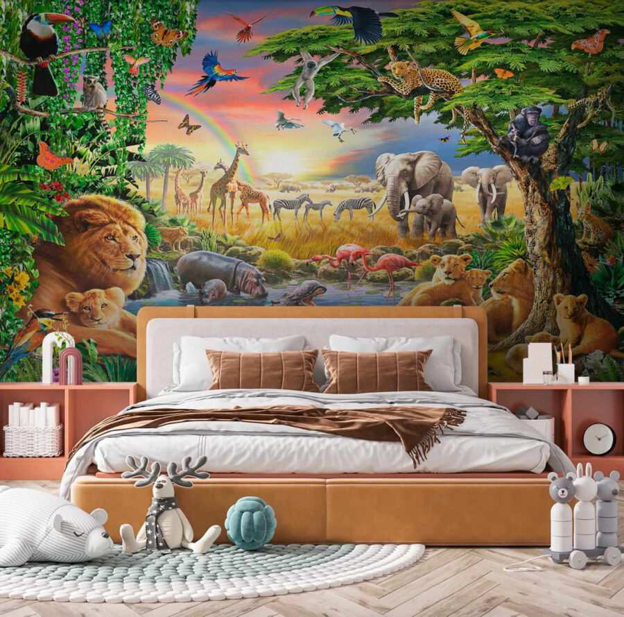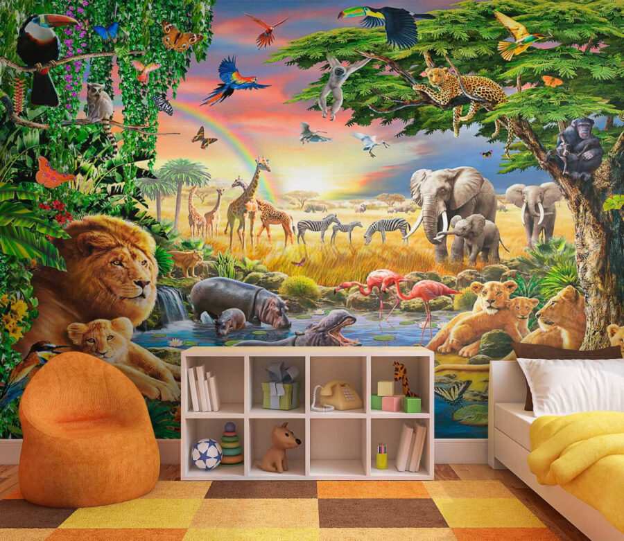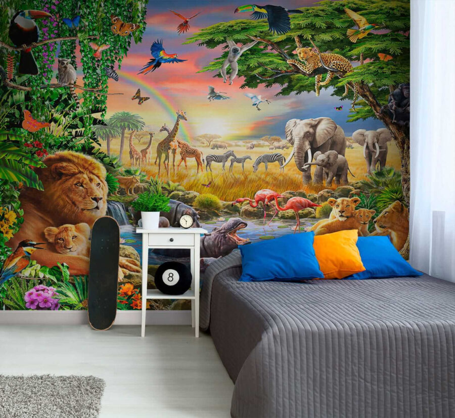 Imaginați-vă că pășiți într-o savană luxuriantă chiar în camera dvs. de zi – despre asta este vorba în acest Fototapet “Savannah animals gather by the water”. Este ca un mini safari african, cu lei care se relaxează, flamingo care fac salturi și elefanți care stau lângă apă. Imaginați-vă asta: veniți acasă după o zi lungă, aruncați o privire la această pictură murală vibrantă și bum – relaxare instantanee. Este mai mult decât un decor; este o scenă plină de viață și culoare. Perfect pentru a adăuga un strop de aventură în orice cameră – doar o privire și aproape că veți auzi chemarea îndepărtată a sălbăticiei. În plus, nu ar fi grozav pentru a stârni conversații cu prietenii? Cu siguranță un spectacol de neuitat!