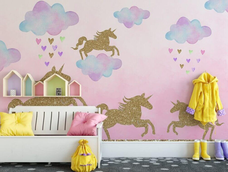 Transformați orice cameră într-un paradis capricios cu acest fototapet încântător. Cu unicorni jucăuși care sar printre nori și împrăștie inimi, acesta aduce o atmosferă veselă care face viața de zi cu zi să pară un pic mai magică. Imaginați-vă că vă treziți în această scenă veselă – este ca și cum ați deschide perdelele către un vis! Perfect pentru o cameră de copii sau un spațiu creativ, acesta încurajează imaginația și bucuria. În plus, unicornii strălucitori adaugă suficientă strălucire pentru a face pe oricine să zâmbească. Cine nu-și dorește un strop de fantezie, nu-i așa? Nu este doar decor, ci o doză zilnică de bucurie!