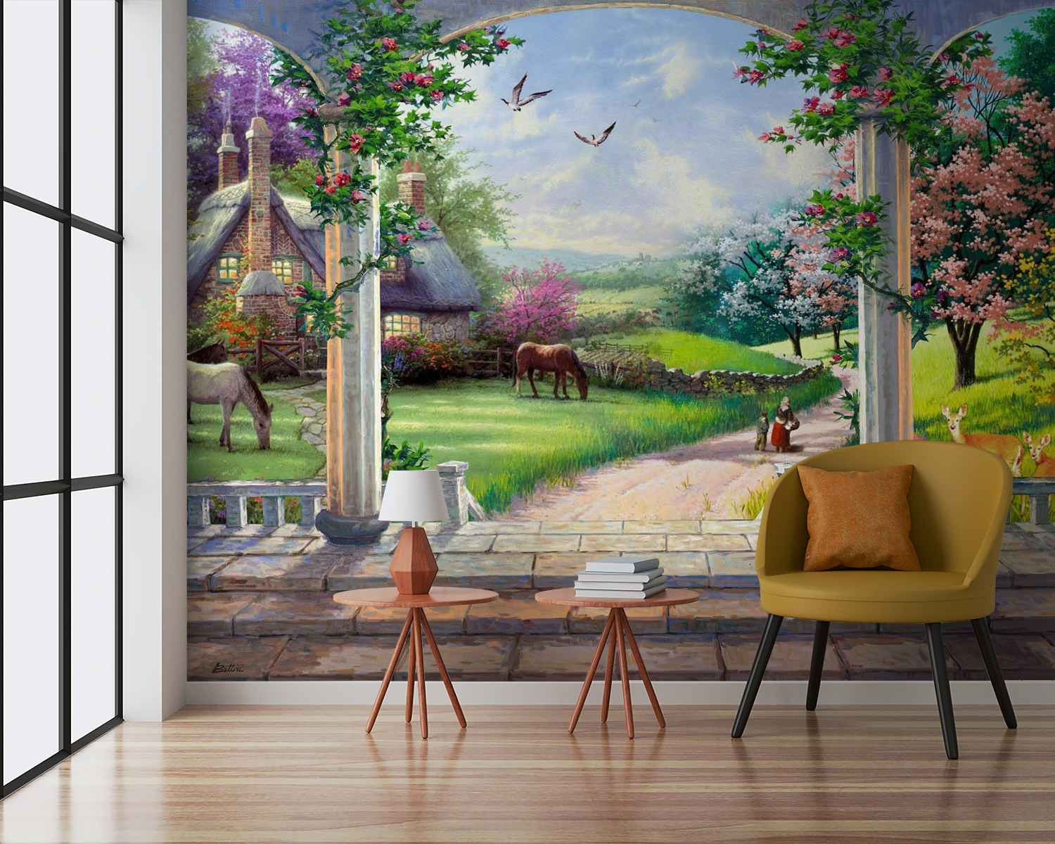 Transformați orice cameră într-un refugiu liniștit cu acest fototapet încântător! Imaginați-vă un peisaj de vis în care caii pasc leneși, iar o căsuță fermecătoare se zărește printre flori vibrante. Este ca și cum ați păși într-o carte de povești – fără a fi nevoie de un portal magic! Imaginați-vă că savurați cafeaua de dimineață în timp ce păsările vă cântă serenade și căprioarele vă fac companie afară. Acest fototapet aduce un strop de natură direct în casa dvs., făcând viața de zi cu zi să pară un pic mai capricioasă. Perfect pentru o atmosferă confortabilă sau pentru a stârni conversații cu prietenii. Cine are nevoie de vacanță când poți trăi într-o operă de artă?