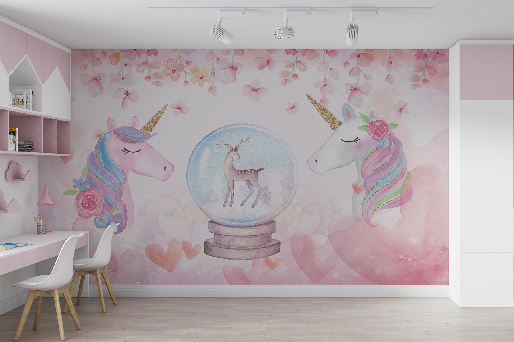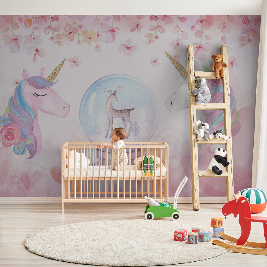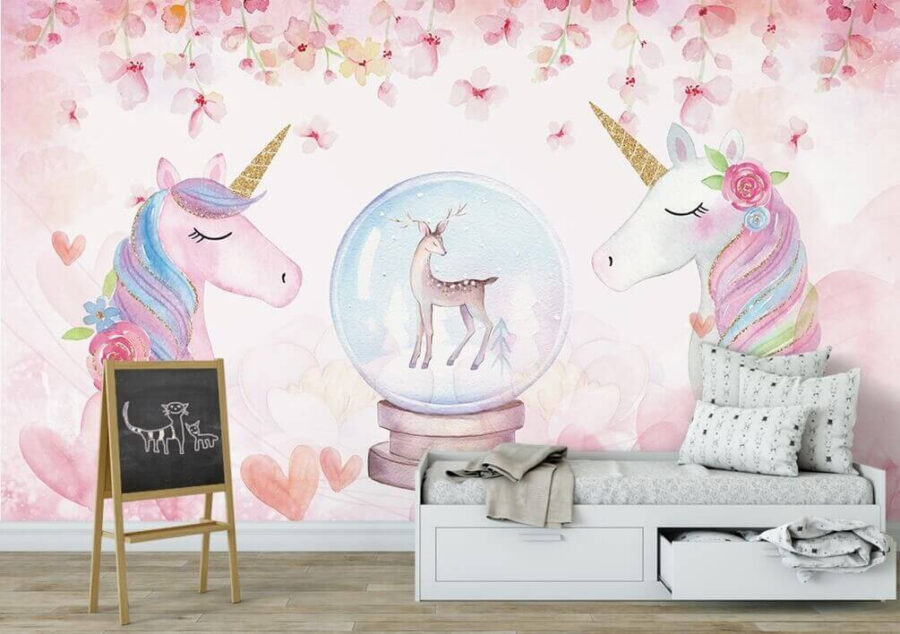 Cu unicorni blânzi printre nuanțe florale roz și o căprioară uimitoare într-un glob de zăpadă, această pictură murală pare desprinsă direct dintr-un basm. Nuanțele moi de acuarelă sunt liniștitoare, în timp ce detaliile jucăușe inspiră imaginație și fantezie.