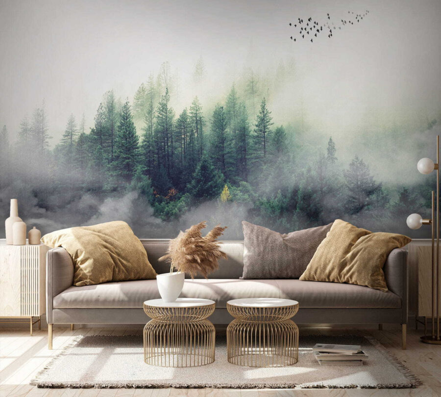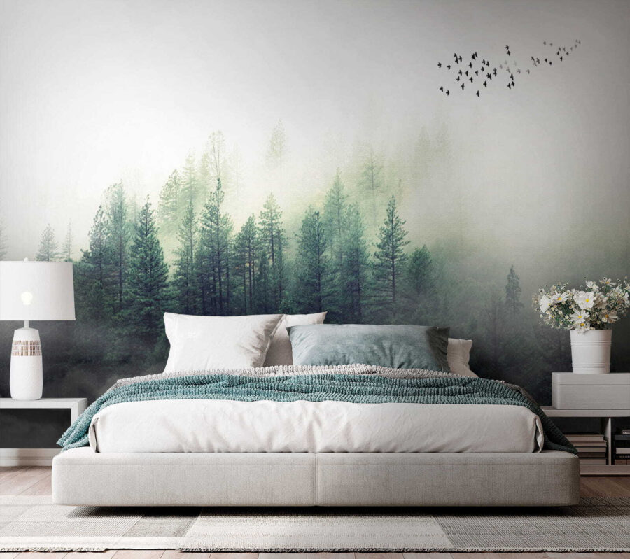 Imaginați-vă că priviți o pădure cețoasă în fiecare dimineață – oh, liniștea! Această pictură murală, “Blurry image of a person’s face” (Imagine neclară a feței unei persoane), este ca și cum ai aduce o atmosferă de cabană confortabilă chiar în sufrageria ta. Pădurea pare atât de magică, aproape ca și cum ai putea intra direct în verdele senin și să te pierzi în natură. În plus, păsările care zboară în depărtare adaugă o notă de fantezie.
