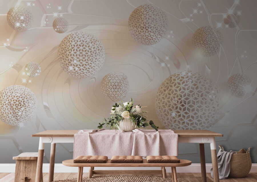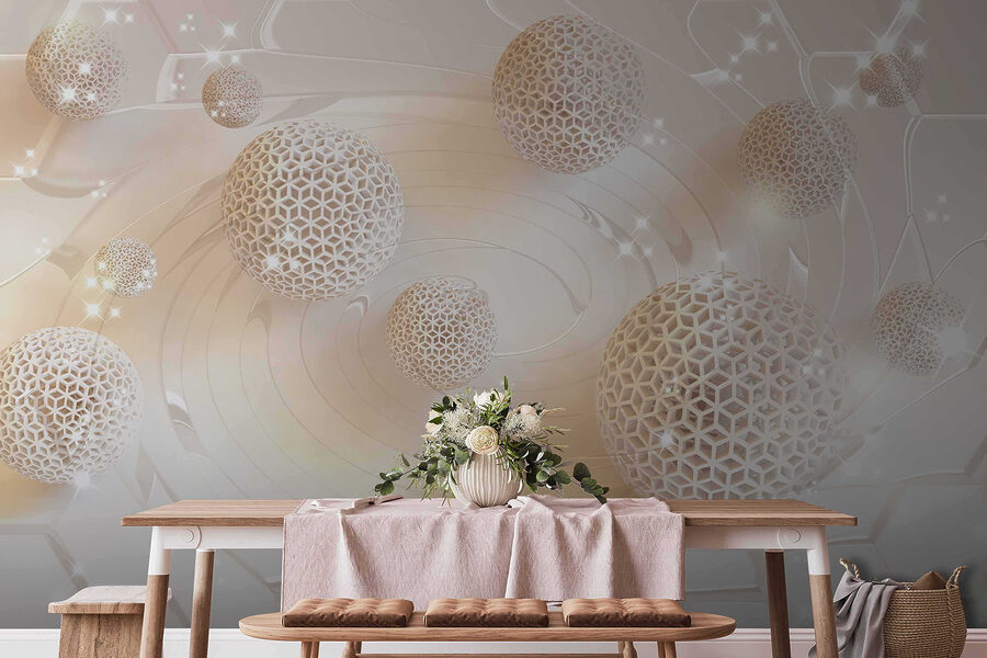 Imaginați-vă că intrați într-o cameră și simțiți că tocmai ați pășit într-o țară a minunilor visătoare și strălucitoare. Este exact ceea ce face “Fototapet Abstract Spheres with Sparkling Design” – transformă orice spațiu în ceva extraordinar. Amestecul de modele geometrice și sfere 3D – aproape par să plutească! – combinate cu o strălucire subtilă, adaugă un strat de magie care captează privirea.