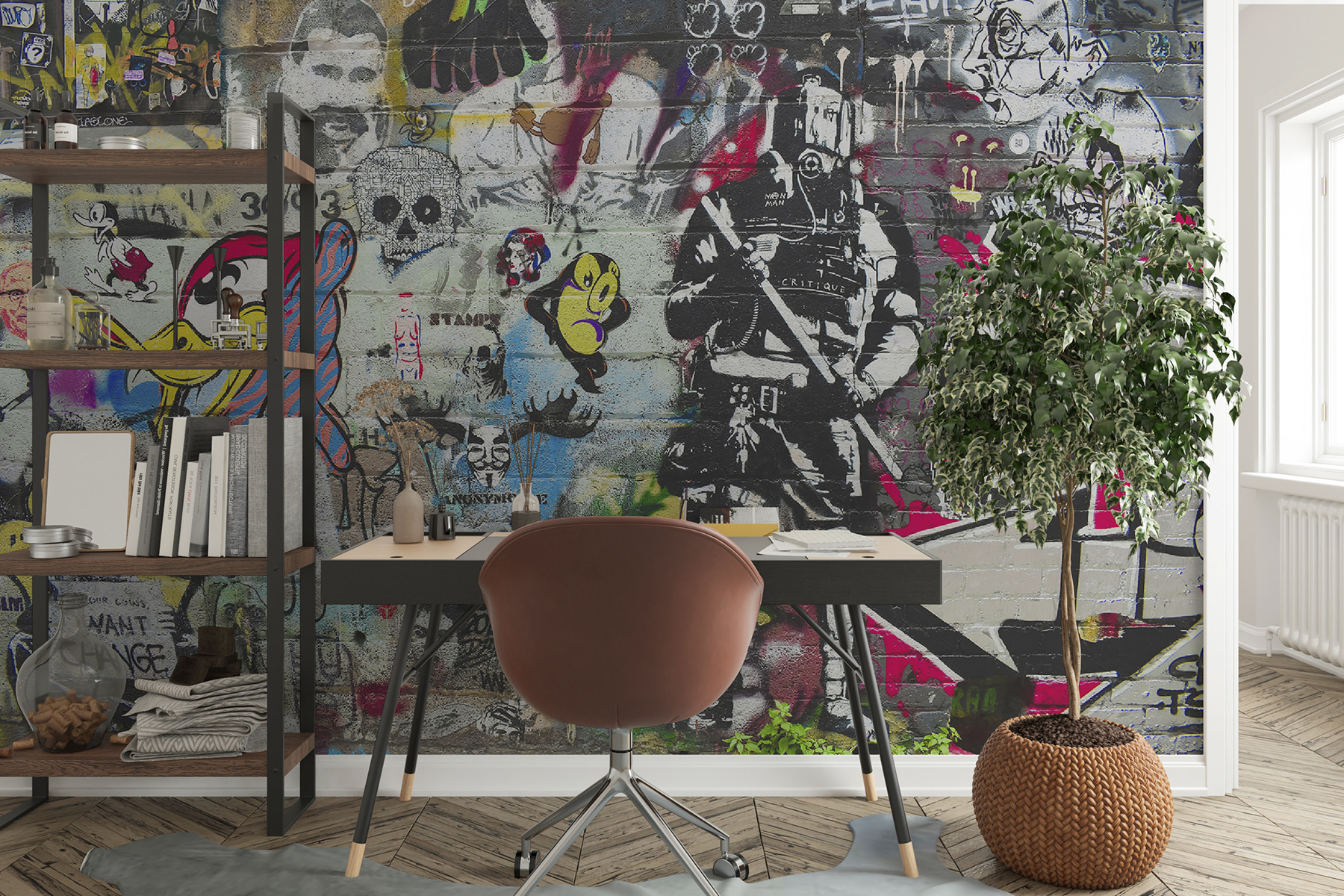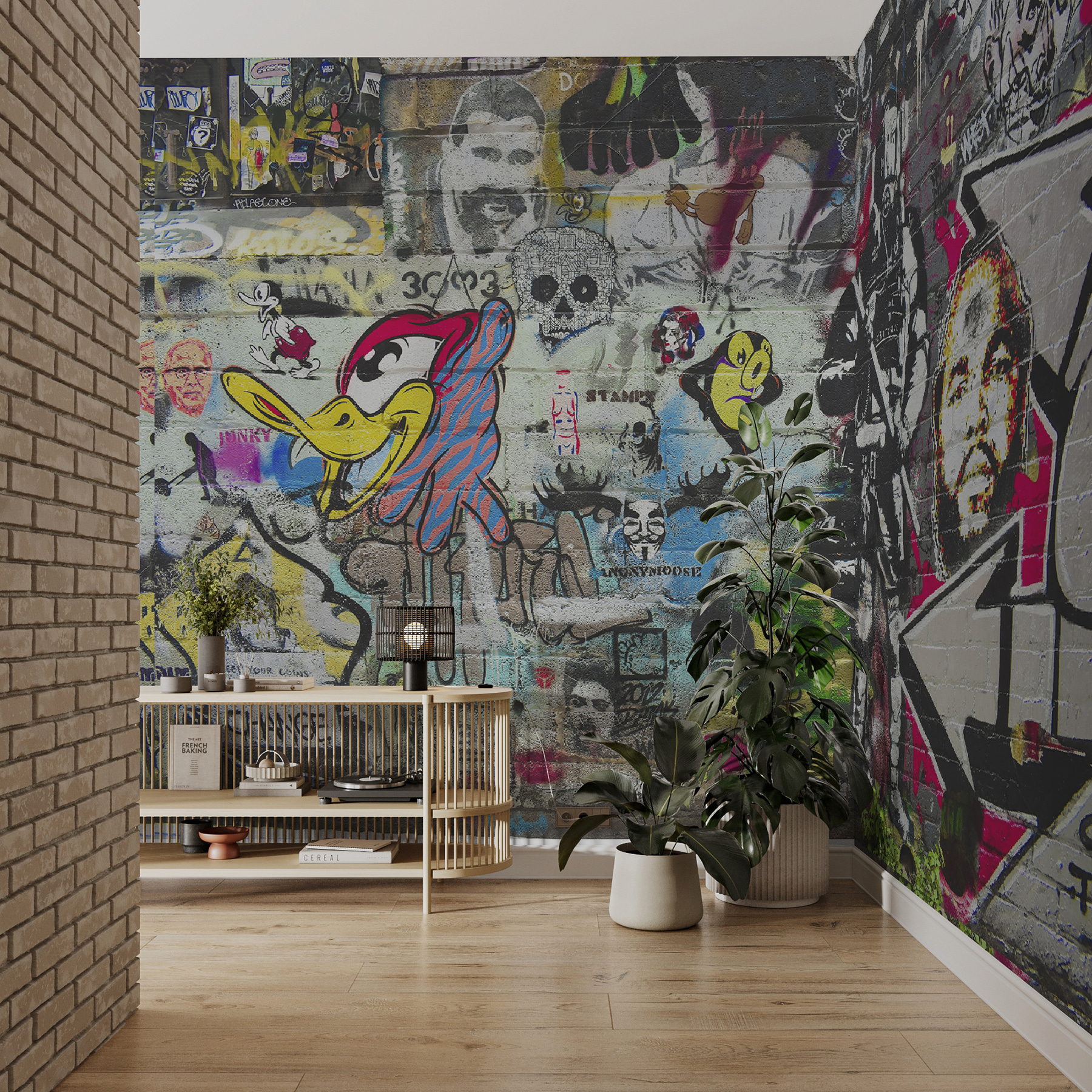 Ai vrut vreodată să te simți ca și cum ai locui într-un loft artistic din oraș? Această pictură murală “Bărbat cu barbă și mustață pictat pe un perete de cărămidă” aduce acel vibe direct în spațiul tău. Nu este doar un perete – este o explozie de personalitate, o declarație îndrăzneață, un starter de conversație. Imaginați-vă cum vă sorbiți cafeaua de dimineață, lăsându-vă ochii să se plimbe peste detaliile complicate și personajele ciudate. Este ca și cum ai avea o mini galerie de artă chiar la tine acasă. În plus, o pictură murală pe un perete de cărămidă are ceva atât de mișto – adaugă o notă de istorie și grunge. Perfect pentru oricine iubește un pic de margine și creativitate în decorul său! Așa că dă-i drumul, lasă-ți pereții să vorbească urban chic!