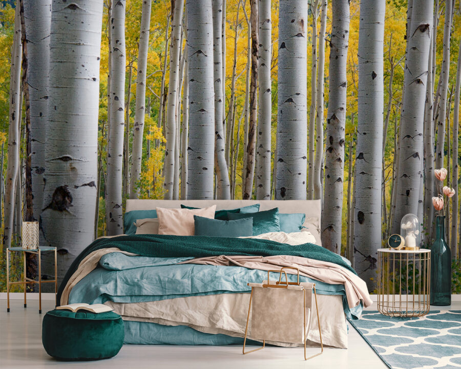 Transformați un spațiu? Această pictură murală care prezintă un grup de copaci albi cu frunzele lor galbene este ca și cum ai avea o felie de natură chiar pe perete. Imaginați-vă că intrați într-o cameră și simțiți instantaneu acea vibrație senină, ca o plimbare liniștită prin pădure, fără să ieșiți din casă. Copacii înalți și eleganți par să stea de veghe, creând un fundal blând care aduce căldură și o notă de culoare. Perfect pentru acele colțuri confortabile sau chiar pentru acel spațiu de birou monoton care are nevoie de puțină viață. Vă va face să vă doriți să turnați o ceașcă de ceai, să luați o carte bună și să vă bucurați de priveliște. Cine ar fi crezut că pereții pot avea o scânteie atât de confortabilă?
