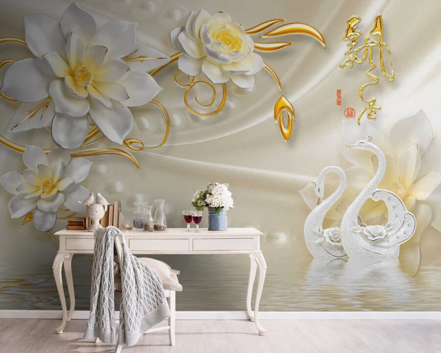 Transformați orice cameră într-o evadare senină cu această pictură murală încântătoare cu lebede încântătoare și flori delicate. Imaginați-vă că pășiți într-o grădină liniștită în care lebedele alunecă grațios pe un iaz strălucitor – sună de vis, nu-i așa? Acest design jucăuș, perfect pentru camerele copiilor sau pentru colțurile confortabile, aduce o notă de natură în interior. Fiecare privire aruncată asupra picturii murale poate evoca sentimente de pace și bucurie, ceea ce o face un fundal ideal pentru joacă sau lectură liniștită. Cu flori care înfloresc frumos, este greu să nu zâmbești! Cine nu și-ar dori un pic din această magie în casa sa?