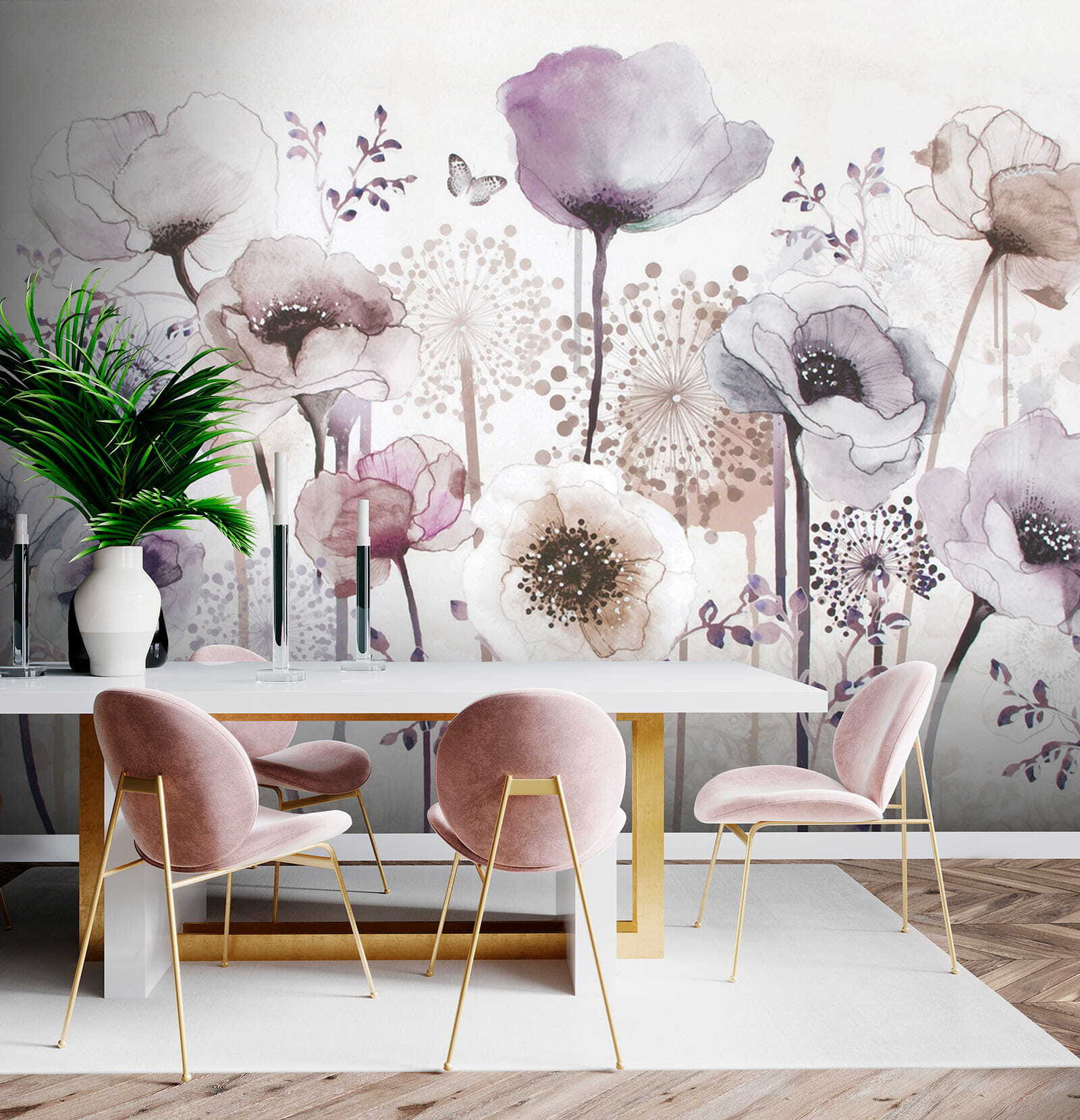 Nu este această pictură murală pur și simplu de vis? Imaginați-vă că pășiți în camera dvs. și vă simțiți ca și cum v-ați fi plimbat într-o grădină fermecată. “Flori și fluturi delicați în acuarelă” captează farmecul unei pajiști senine, cu petale moi în nuanțe de lavandă și fard de obraz. Acești fluturi mici adaugă o notă atât de capricioasă – ca și cum ar fi pe cale să zboare departe! Perfectă pentru un dormitor sau un colțișor de lectură confortabil, această pictură murală aduce împreună calmul și frumusețea. Prietenii ar putea crede că ai petrecut ore întregi pictând-o singură… și este în regulă să îi lași să creadă asta!