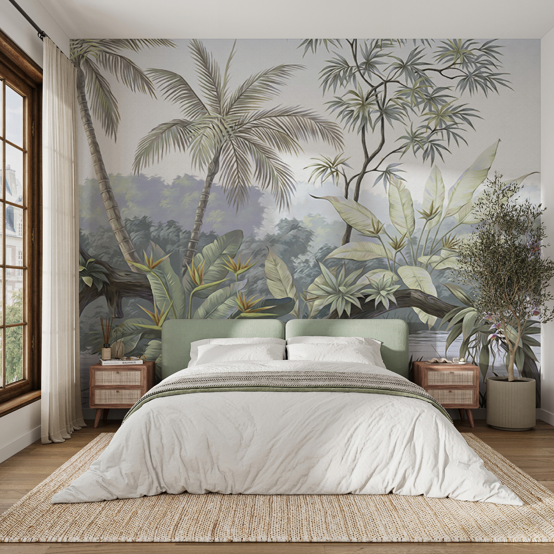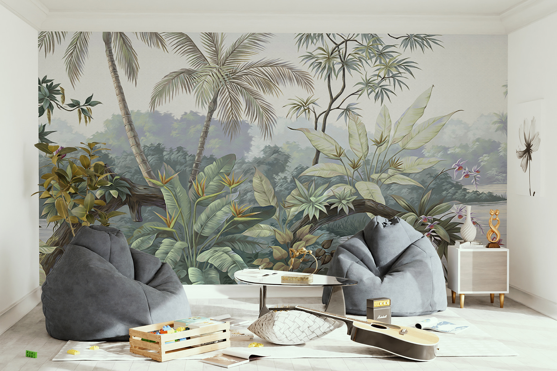 Imaginați-vă că sunteți înconjurat de un paradis tropical de vis – palmieri strălucitori și verdeață luxuriantă, fără bilet de avion! Această pictură murală, “Imaginea neclară a unei flori”, vă introduce într-un paradis liniștit. Imaginați-vă sorbindu-vă cafeaua de dimineață în timp ce priviți plantele sărutate de ceață. Este perfect pentru a adăuga o notă tropicală în orice cameră. Vă ajută să evadați, chiar dacă este doar pentru o clipă. Ideală pentru cei care visează cu ochii deschiși, iubitorii de plante sau pentru oricine dorește o atmosferă senină. Este calmă și răcoritoare, șoptind un cântec de leagăn moale al naturii în casa ta. Se simte ca o mini-vacanță în fiecare zi!