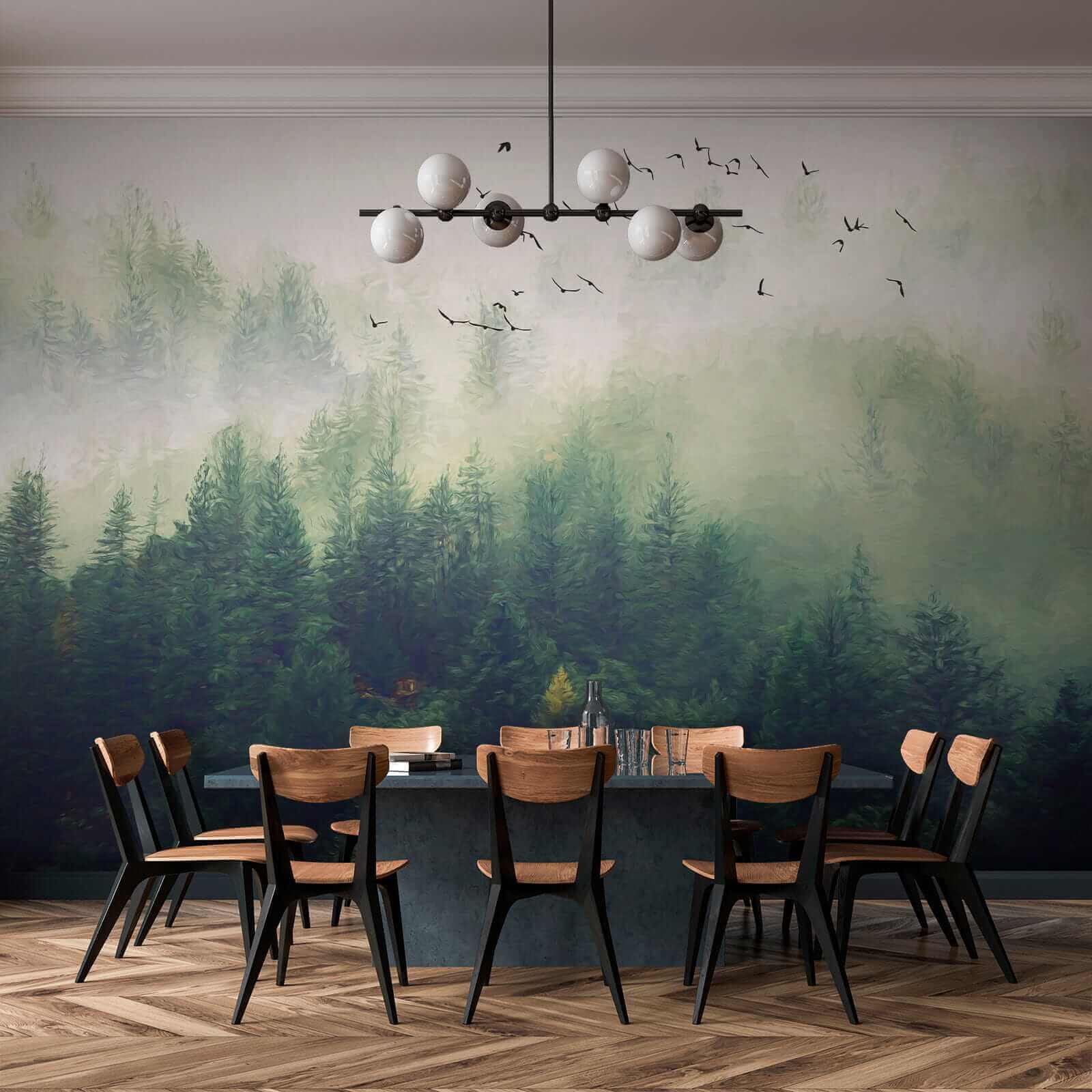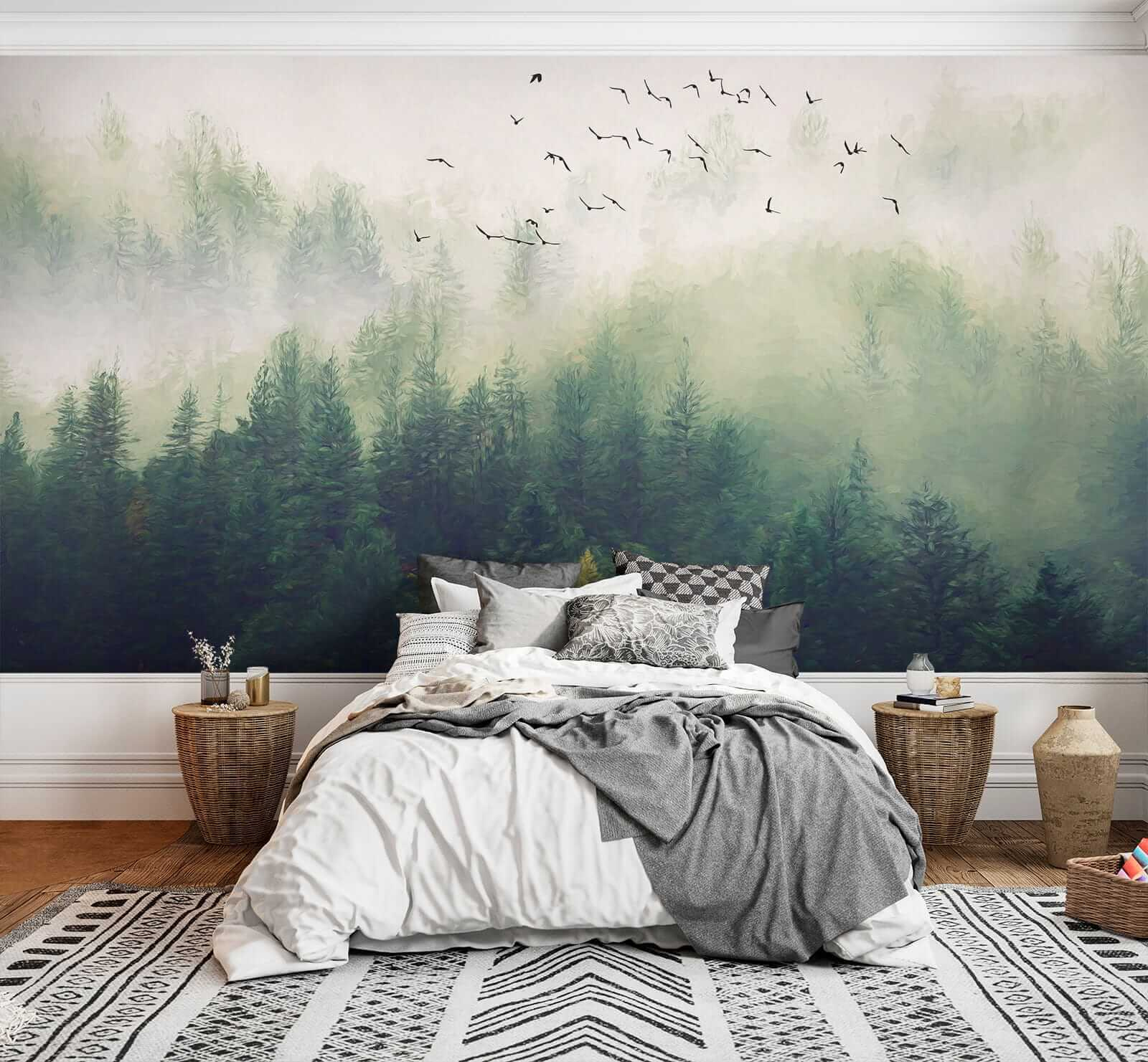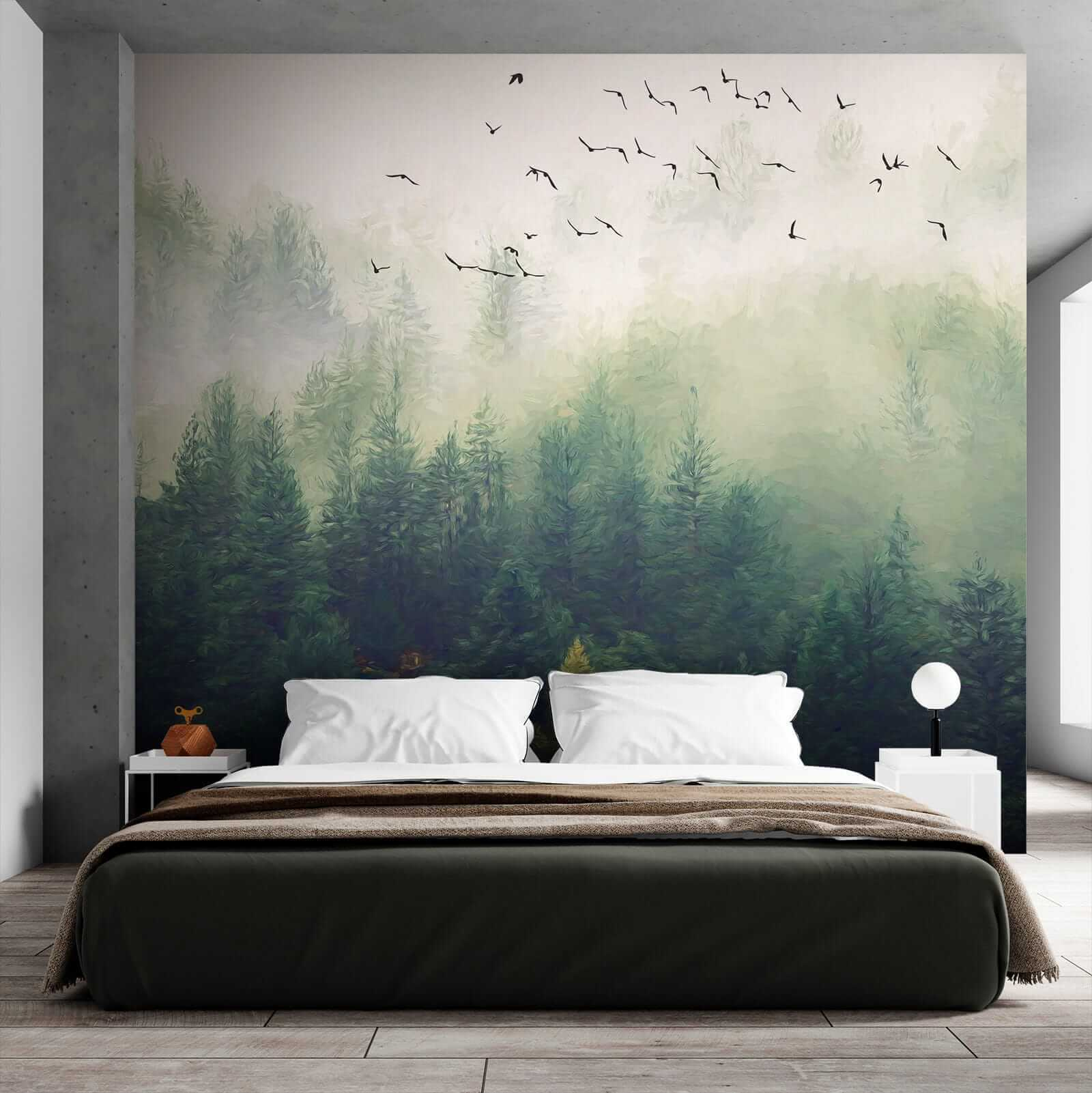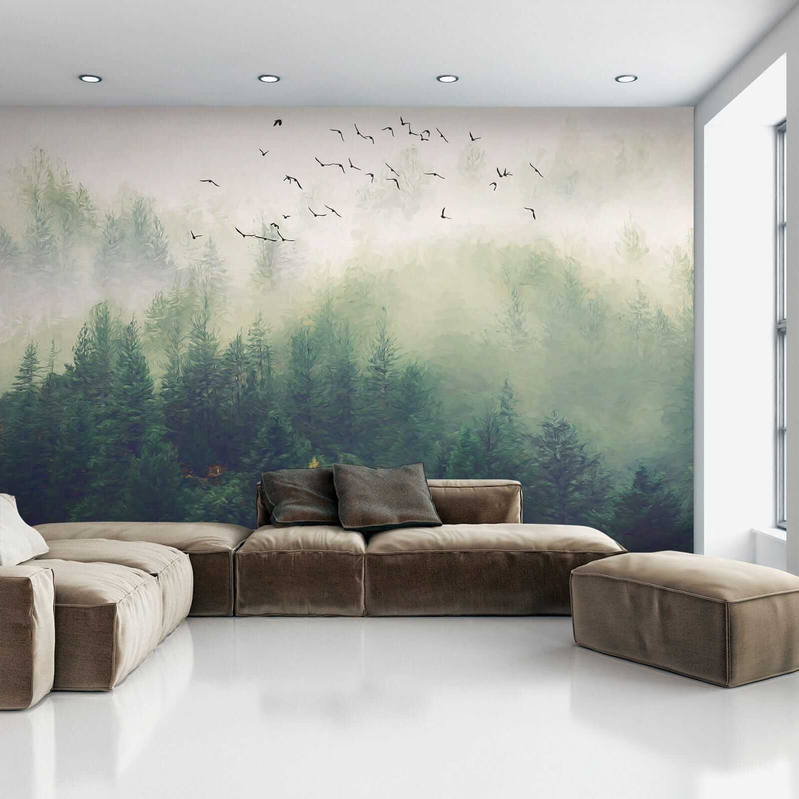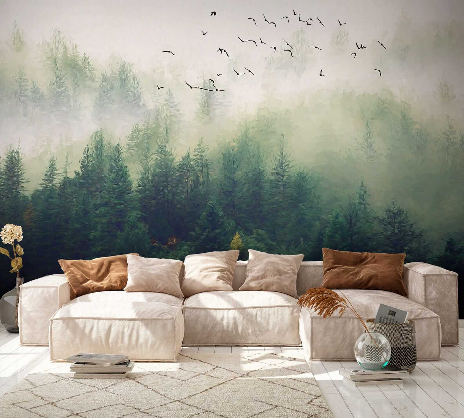 Transform your space with this stunning mural featuring birds soaring over a misty forest. Imagine stepping into a serene escape right in your living room! The gentle greens and soft fog wrap around you like a cozy blanket, while the birds seem to invite you to join their journey. It’s like nature decided to home decor itself!