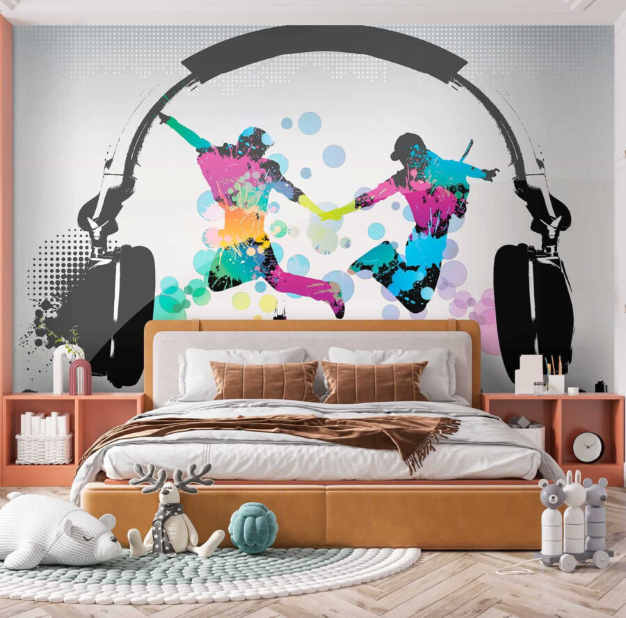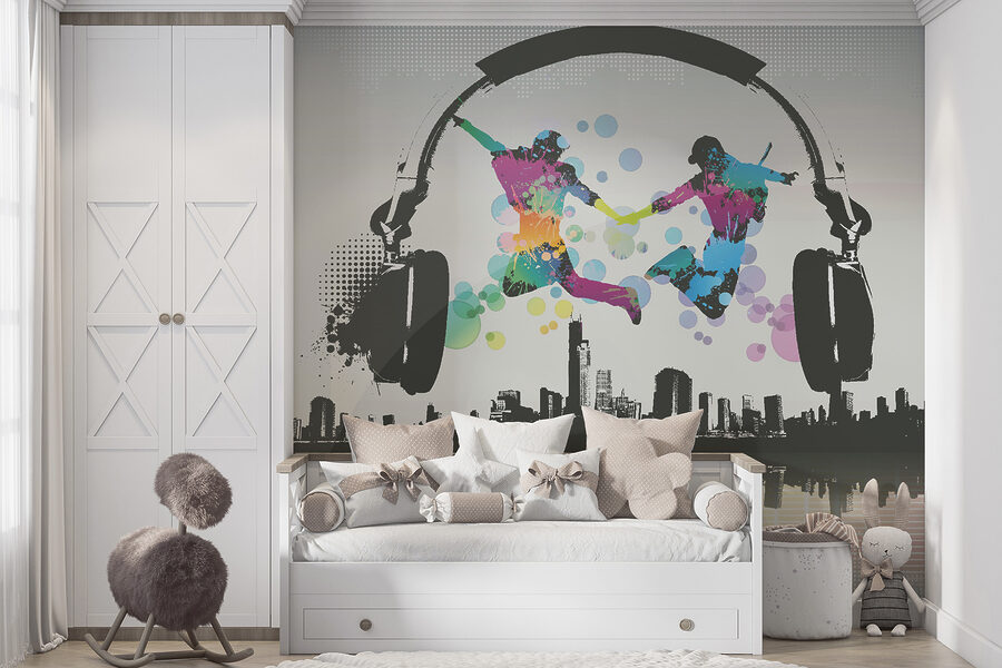 Designul prezintă două figuri care sar exuberant pe fundalul unui peisaj urban și al unor căști uriașe – este ca și cum ar dansa în propriul lor ritm, invitându-i pe toți cei care îi văd să se alăture distracției. Stropirile îndrăznețe de culoare vă vor atrage instantaneu atenția și vă vor ridica moralul! În plus, se află în categorii precum “Tapet de designer pentru perete” și “Murale de perete populare”, așa că știți că sunteți pe ceva special.