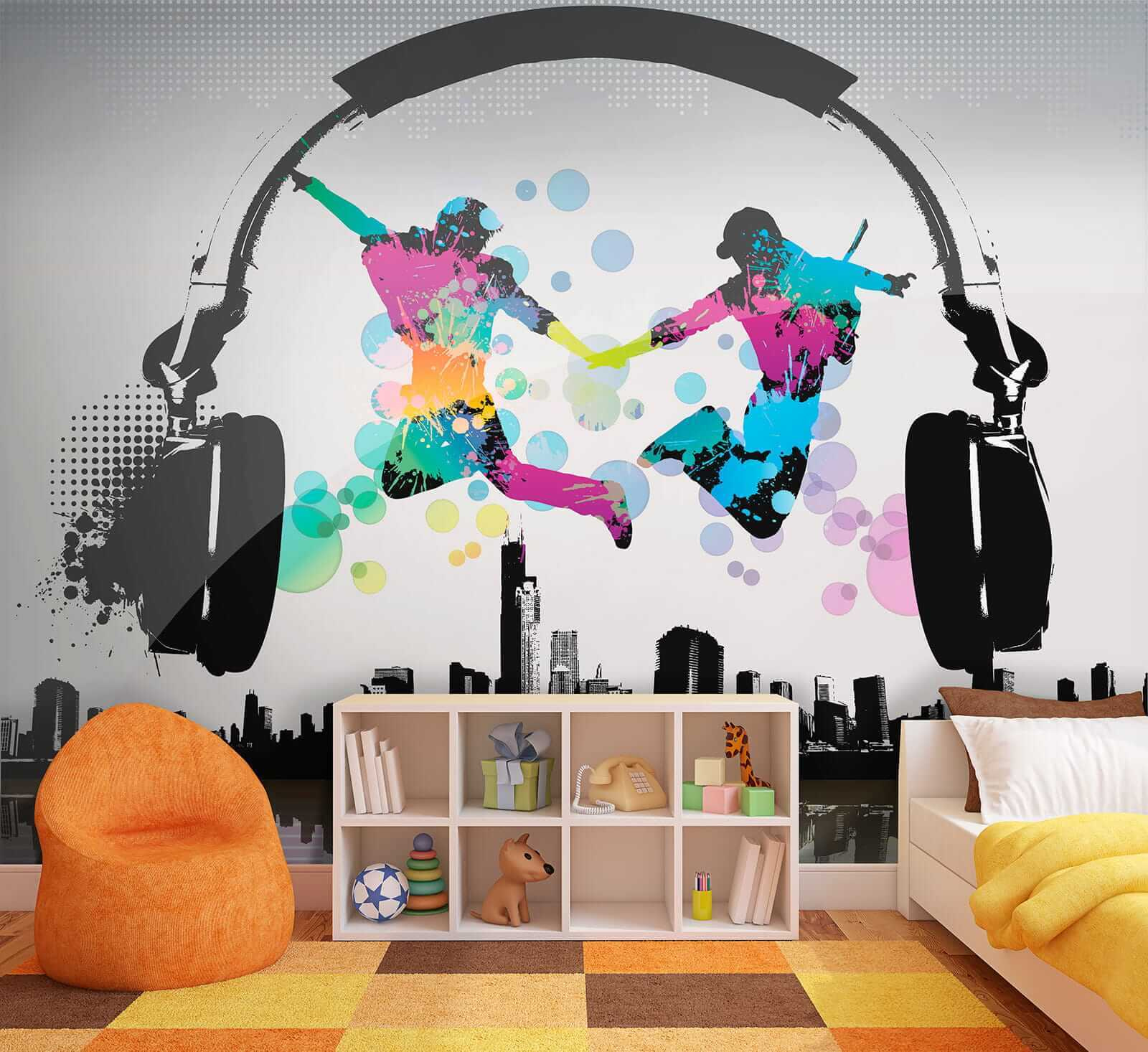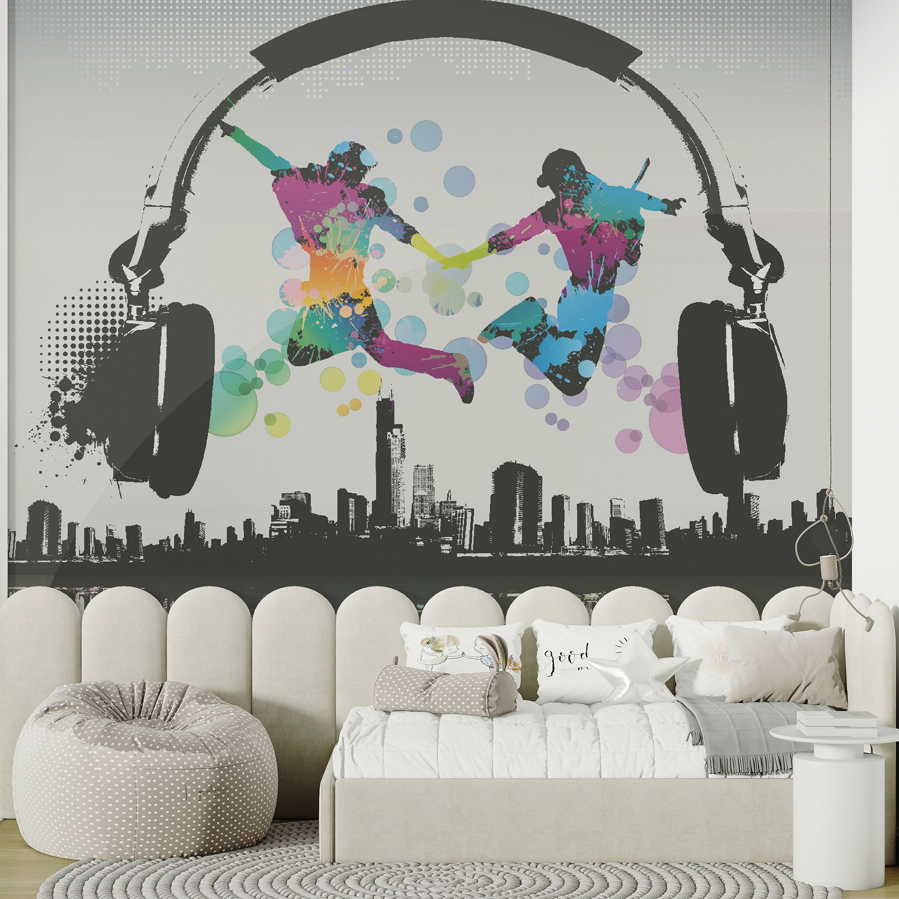 Designul prezintă două figuri care sar exuberant pe fundalul unui peisaj urban și al unor căști uriașe – este ca și cum ar dansa în propriul lor ritm, invitându-i pe toți cei care îi văd să se alăture distracției. Stropirile îndrăznețe de culoare vă vor atrage instantaneu atenția și vă vor ridica moralul! În plus, se află în categorii precum “Tapet de designer pentru perete” și “Murale de perete populare”, așa că știți că sunteți pe ceva special.
