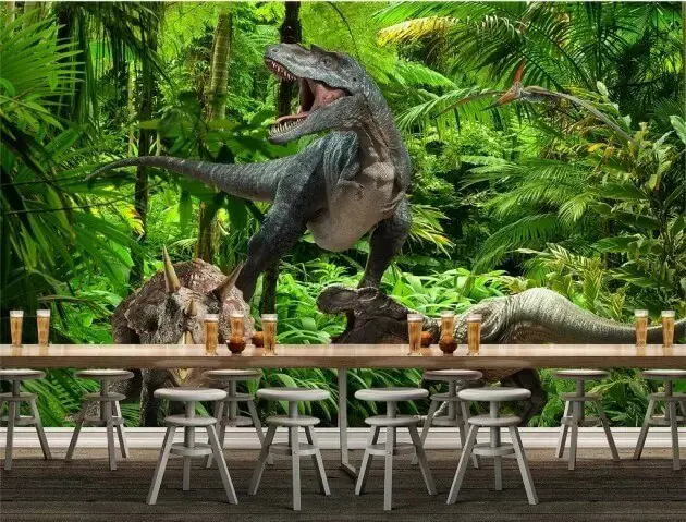 Transform any wall into a prehistoric paradise with this vibrant mural featuring a group of dinosaurs in a lush forest. Imagine walking into a room that feels like a thriving Jurassic jungle—bold colors and fierce creatures leaping out at you, inviting an adventure right from your living room. The playful T-Rex, the mighty Triceratops, and even a sly Pterosaur soaring above bring a delightful sense of wonder. It’s not just decor; it’s a conversation starter. Kids will dream of dino adventures, while adults may fondly recall childhood favorites. Perfect for playrooms or any space that could use a splash of excitement. Who wouldn’t want a little piece of the prehistoric era right at home? Adding this mural will surely spark joy and a few giggles every time someone steps inside.