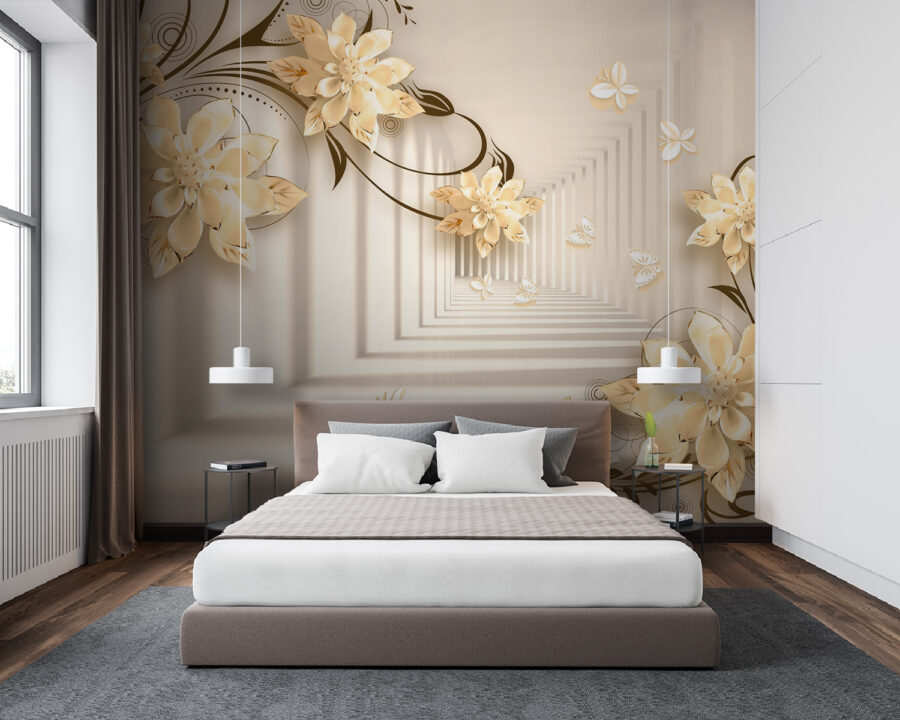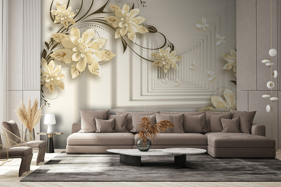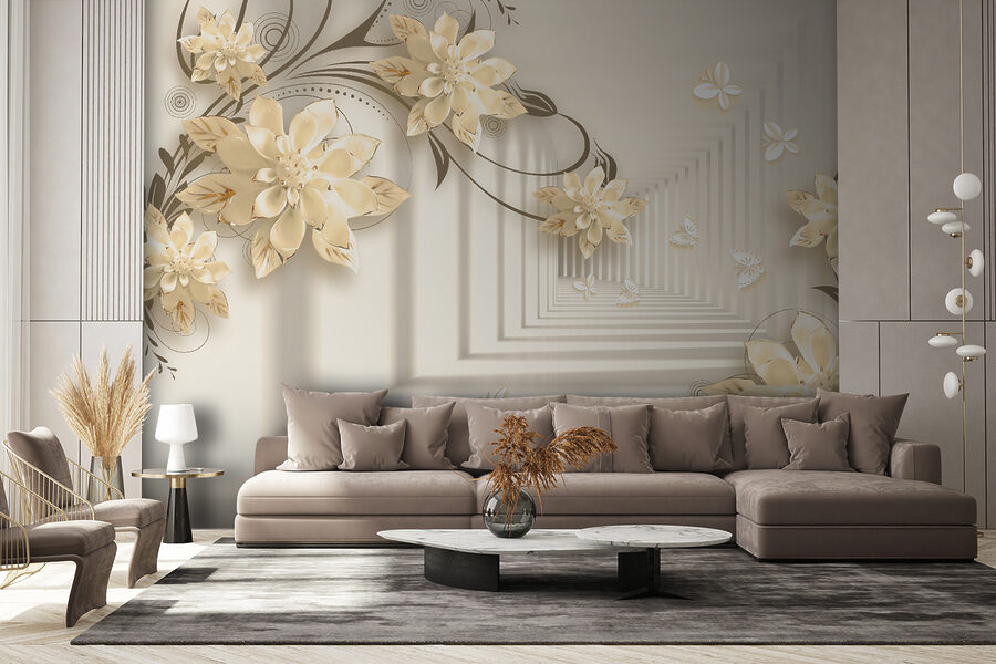 Imaginați-vă că aveți un perete care seamănă cu o grădină capricioasă – chiar în camera dvs. de zi! Acest mural “Design floral elegant cu fluturi” face exact asta. Este ca și cum ați păși într-o fantezie senină în care florile înfloresc la nesfârșit, iar fluturii zboară pe lângă ele. Imaginați-vă aceste flori 3D elegante ieșind în evidență, creând o vibrație moale, de vis… Este ca și cum ați avea arta naturii chiar în casă!