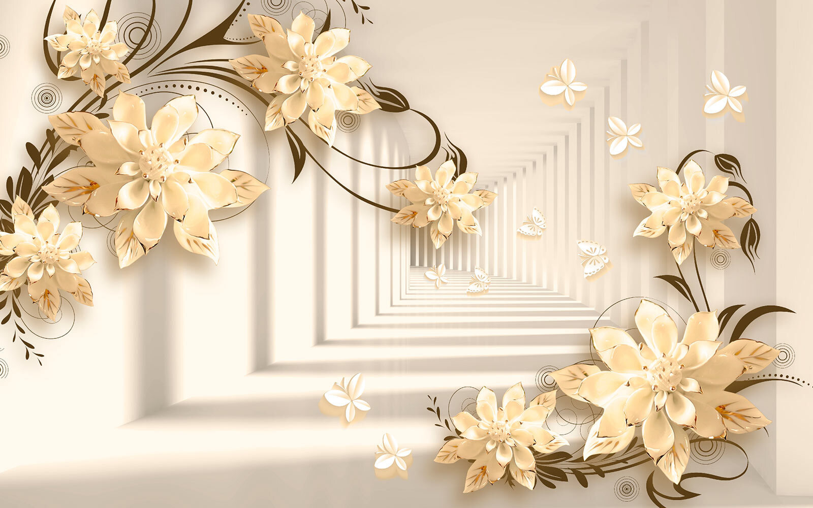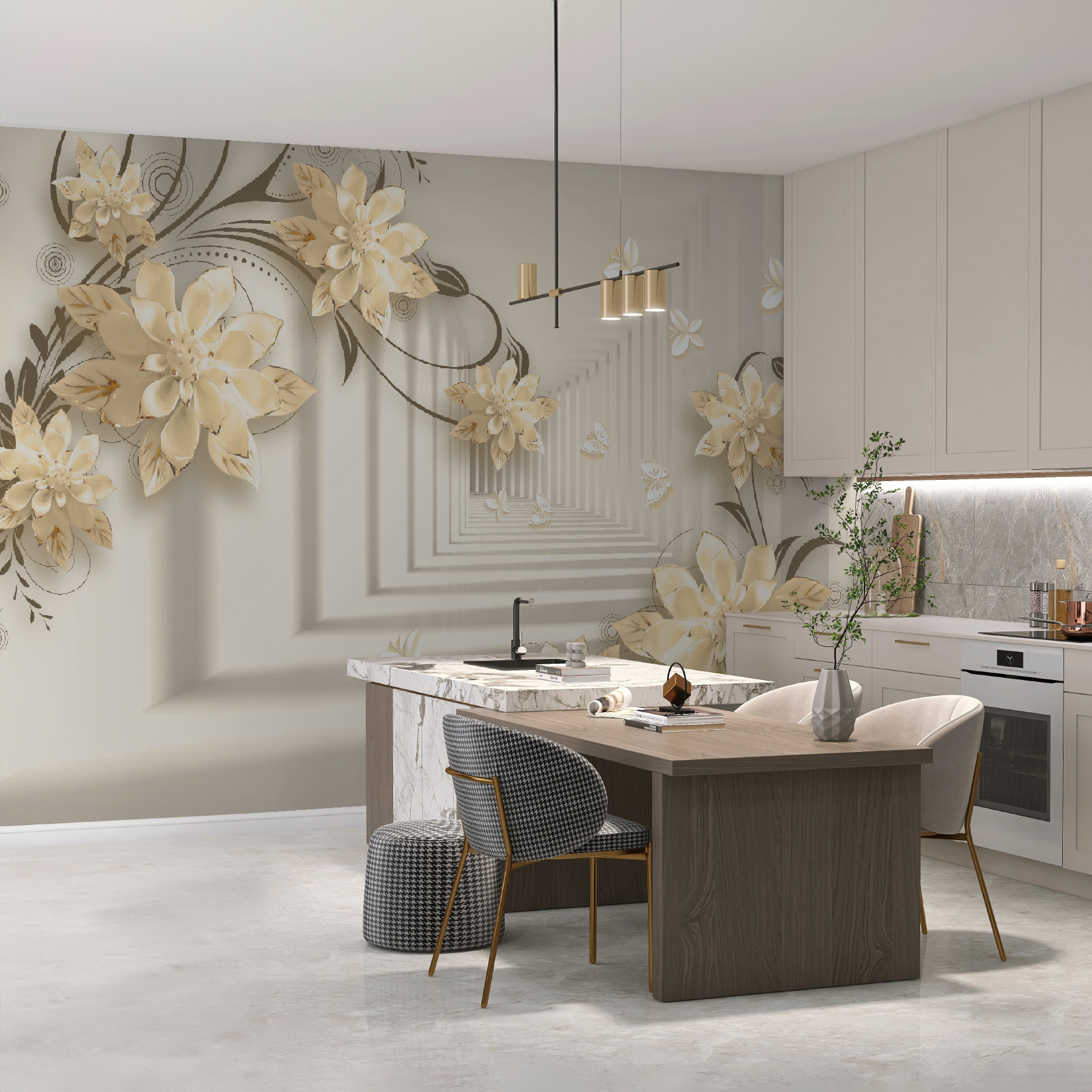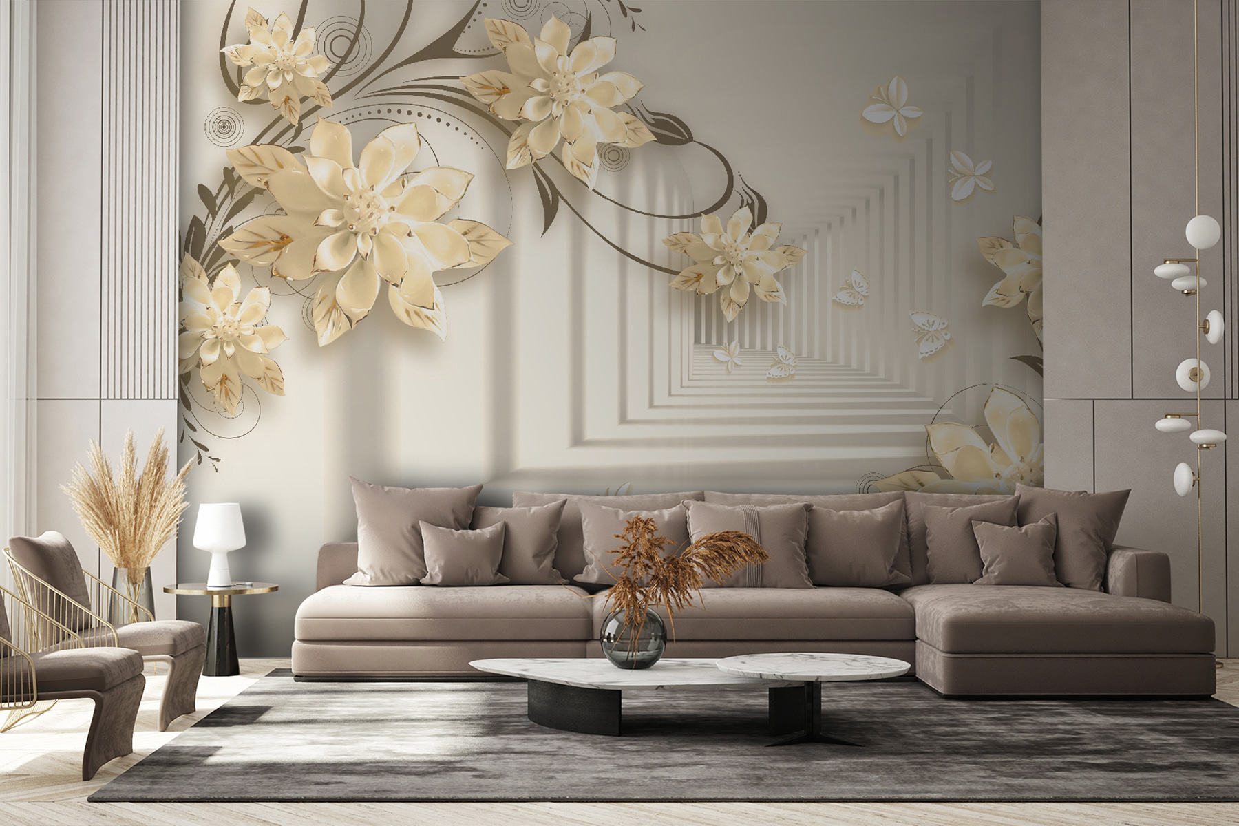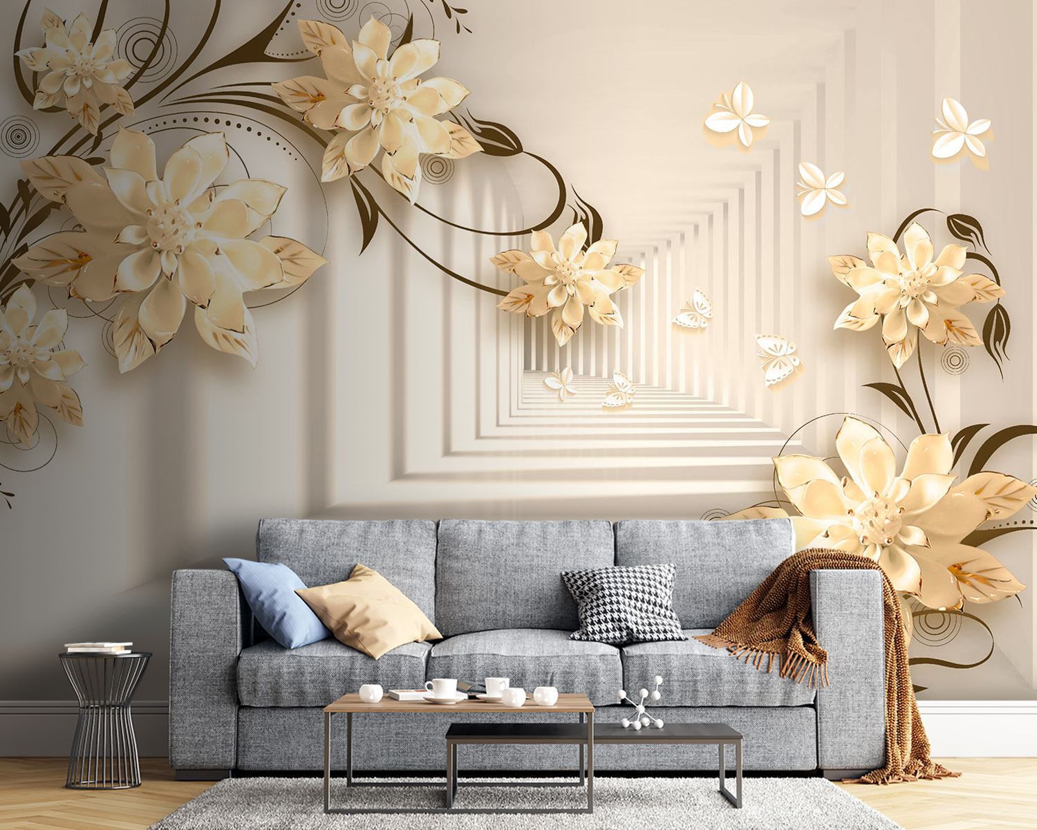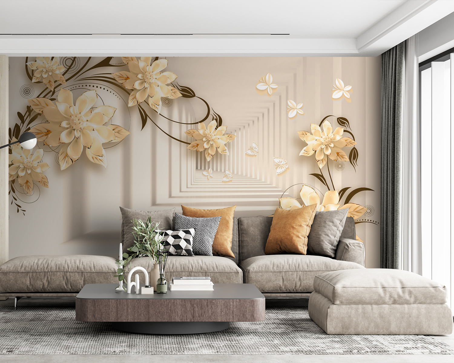 Imaginați-vă că aveți un perete care seamănă cu o grădină capricioasă – chiar în camera dvs. de zi! Acest mural “Design floral elegant cu fluturi” face exact asta. Este ca și cum ați păși într-o fantezie senină în care florile înfloresc la nesfârșit, iar fluturii zboară pe lângă ele. Imaginați-vă aceste flori 3D elegante ieșind în evidență, creând o vibrație moale, de vis… Este ca și cum ați avea arta naturii chiar în casă!