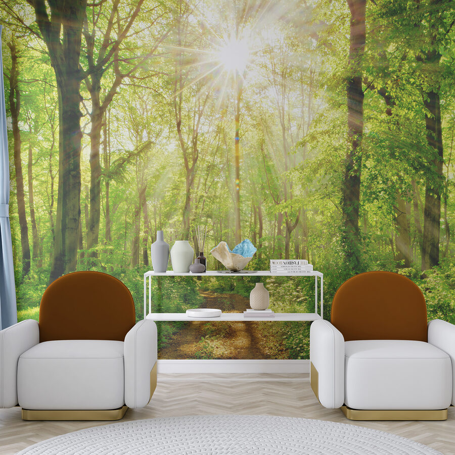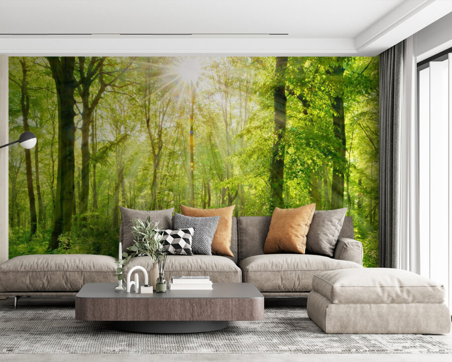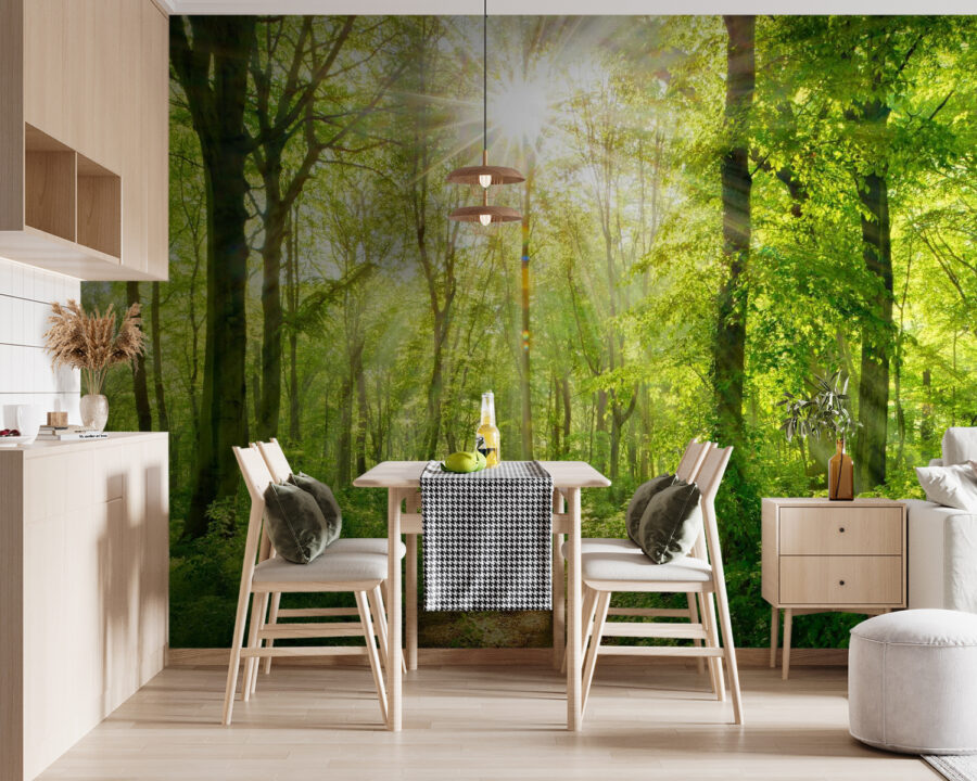 Transformați-vă spațiul cu această pictură murală captivantă, cu raze de soare pătrunzând printre copaci luxurianți. Imaginați-vă că intrați în camera dvs. și simțiți că ați pășit într-o pădure liniștită – zona de relaxare supremă a naturii. Verdele vibrant se evidențiază, invitând la vibrații calme, aproape ca și cum ai auzi foșnetul blând al frunzelor. Fie că este colțul tău de lectură sau un loc de întâlnire plin de viață, această pictură murală joacă un joc încântător asupra simțurilor. Este ca o gură de aer proaspăt pentru pereții dvs., creând fundalul perfect pentru discuții confortabile sau momente liniștite de singurătate. În plus, este plăcut să te gândești că un pic de natură poate aduce atâta bucurie în interior.