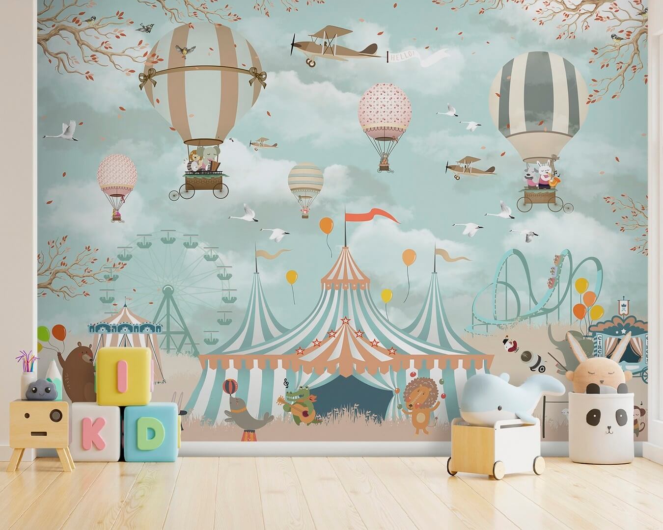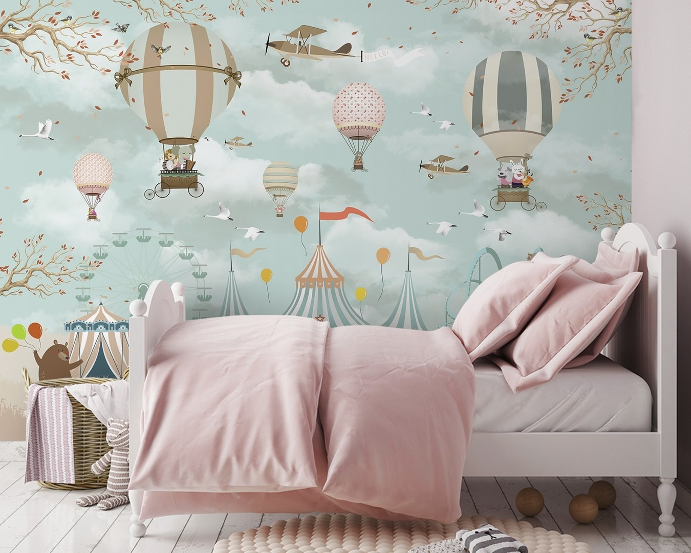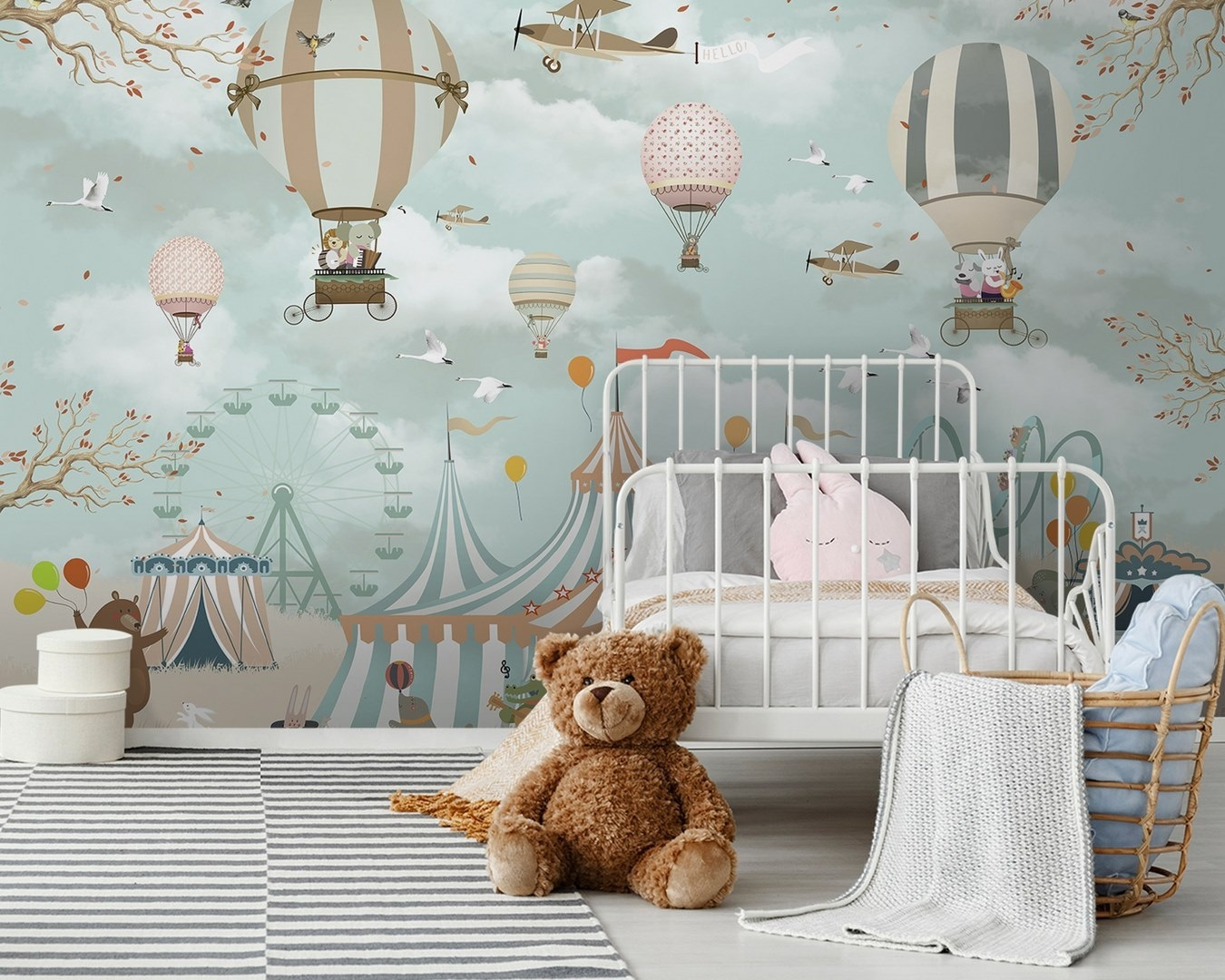 Imaginați-vă că intrați într-un spațiu care seamănă cu o aventură capricioasă. Această pictură murală, cu baloane cu aer cald fermecătoare și păsări jucăușe, creează un cer încântător unde imaginația zboară. Fiecare personaj aduce un pic de bucurie, stârnind povești și vise cu ochii deschiși – fie că este vorba despre un elefant curajos sau un urs elegant cu baloane. Perfect pentru camera unui copil sau pentru orice loc care ar avea nevoie de un strop de distracție, evocă amintiri din copilărie despre excursiile la circ și zilele însorite petrecute afară. Transformați peretele și lăsați magia să-și ia zborul – cine nu și-ar dori să plutească sub acest cer fermecător?