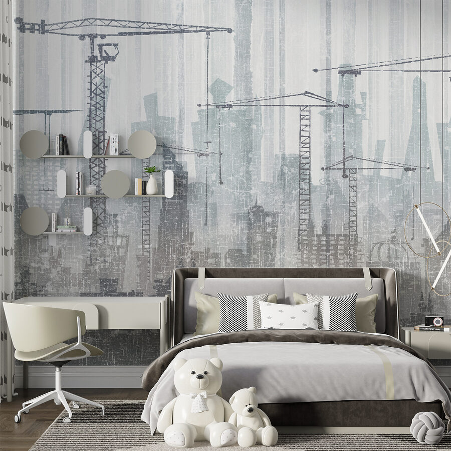 Priviți această pictură murală ingenioasă, “Cityscape with Cranes” – perfectă pentru oricine este interesat de vibrațiile urbane cool. Imaginează-ți că te uiți la peretele tău și vezi acest desen geometric îndrăzneț cu macarale în picioare pe fundalul unui oraș modern. Are acel aspect trendy, nefinisat pe care îl vedeți în cele mai bune decoruri în stil industrial. Griurile și alburile atenuate pot părea simple, dar creează o profunzime grozavă, asemănătoare 3D, care aproape că te face să te simți ca și cum ai sta în mijlocul unui șantier de construcții aglomerat – fără zgomot, din fericire!