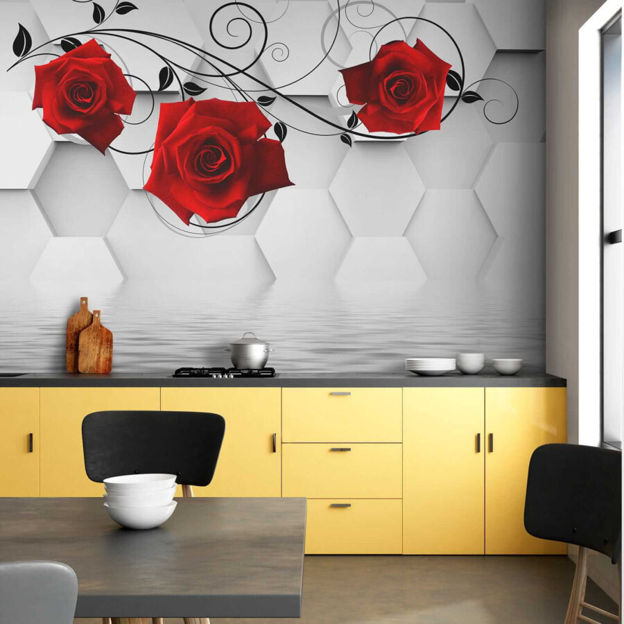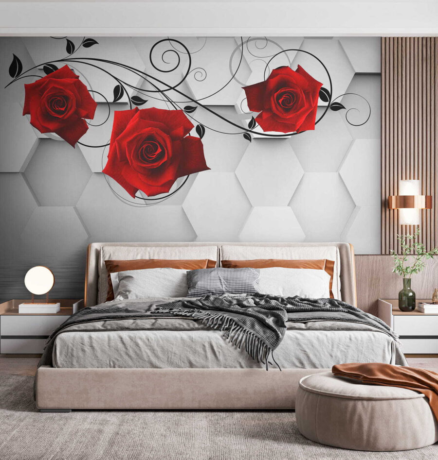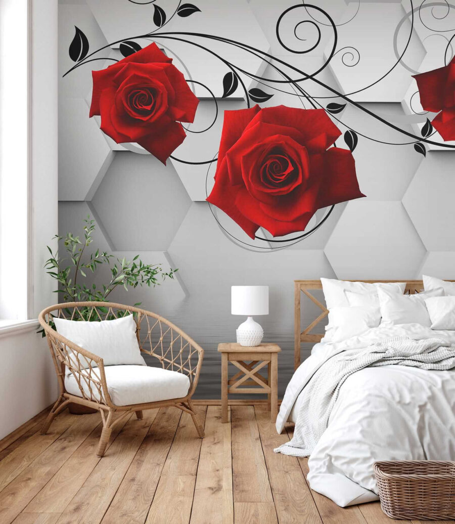 Transformați-vă spațiul cu acest tapet uimitor, cu trandafiri roșii vibranți împletiti grațios cu viță de vie neagră elegantă. Este ca și cum ați avea o grădină înflorită chiar în sufrageria dvs., fără stropitoarea și zumzetul ocazional al albinelor. Fundalul cu hexagoane elegante conferă un aspect modern, în timp ce trandafirii adaugă o notă de romantism, perfectă pentru a crea o atmosferă confortabilă. Fie că este vorba de o cafea leneșă în dimineața de weekend sau de o cină animată, acest tapet creează atmosfera potrivită. Este genul de decor care stârnește conversații și poate câteva visuri cu ochii deschiși despre grădini secrete. Cine nu s-ar simți puțin mai inspirat privind aceste frumuseți?