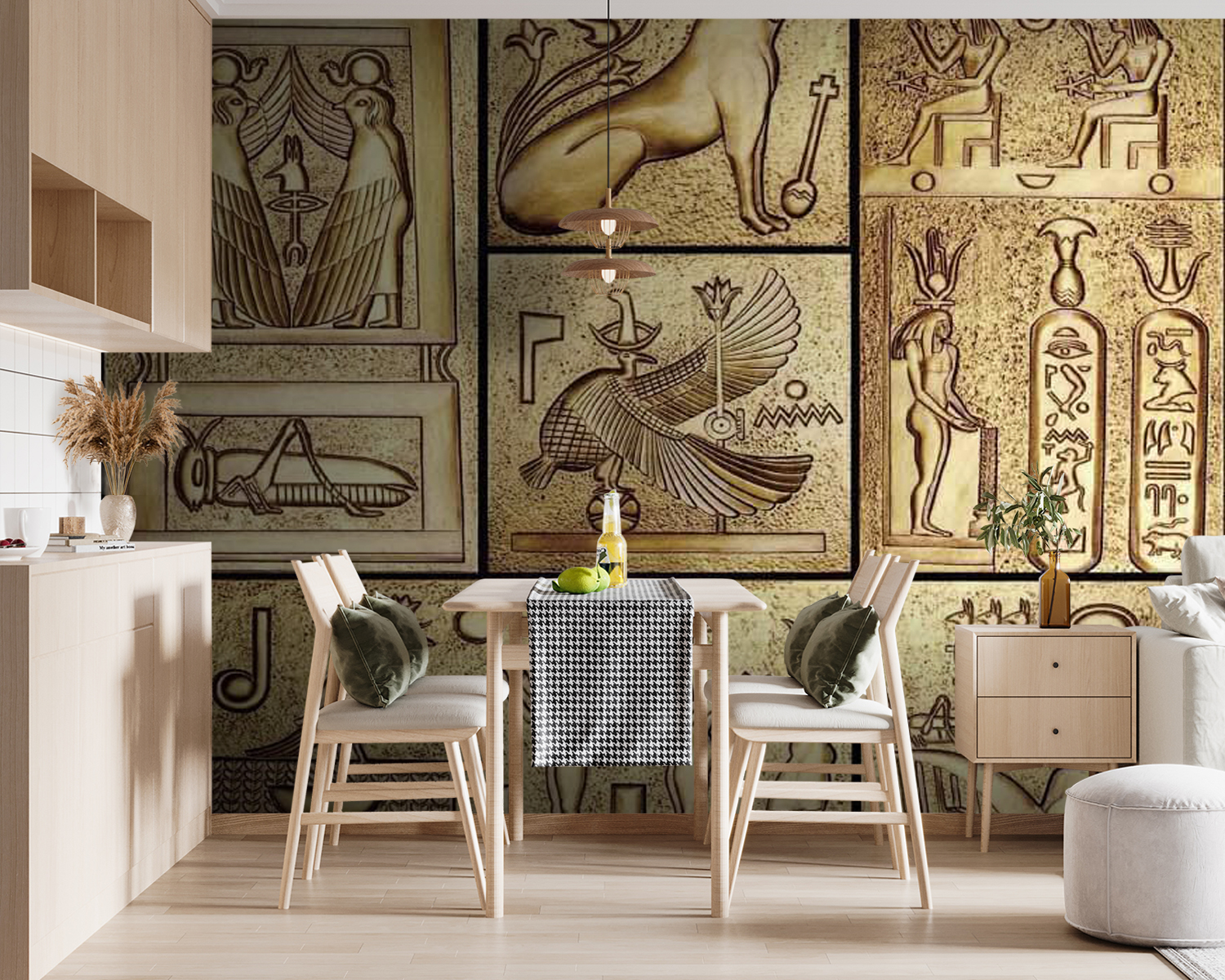 Transformați-vă spațiul cu acest colaj uimitor de simboluri egiptene antice. Este ca și cum ai avea o expoziție muzeală chiar în casa ta! Imaginați-vă că treceți pe lângă acest mural și simțiți cum poveștile faraonilor și ale zeităților mistice prind viață. Fiecare desen complicat invită la explorare, stârnind conversații care persistă mult timp după plecarea oaspeților. Este cald și pământesc, făcând ca orice cameră să fie primitoare și puțin misterioasă – perfect pentru cei care apreciază istoria sau un pic de fantezie în decorul lor. Imaginați-vă: o seară confortabilă, lumini blânde și șoaptele tăcute ale poveștilor străvechi care vă înconjoară. Pregătiți-vă pentru un farmec cu adevărat atrăgător!
