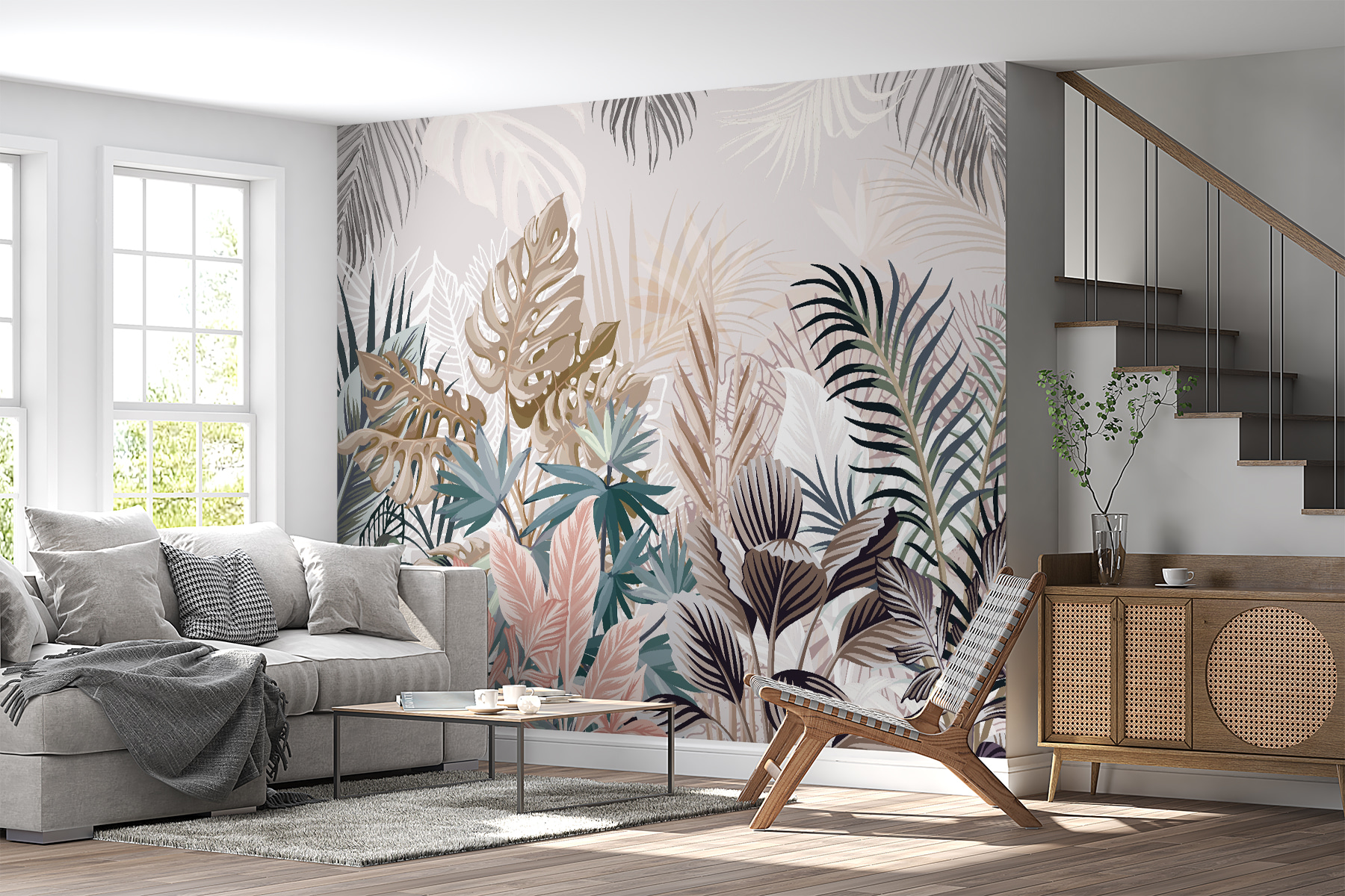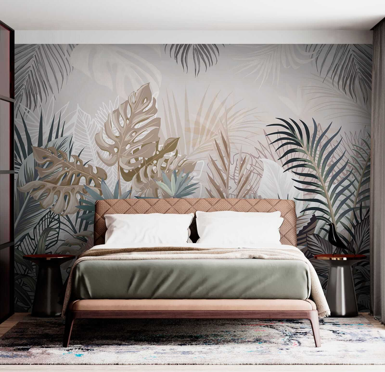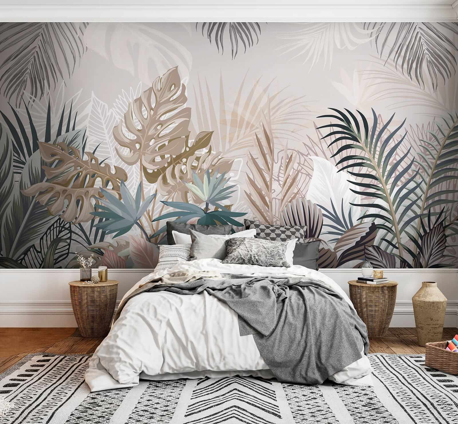 Vă gândiți să vă modernizați spațiul? Acest mural “Frunze tropicale în nuanțe atenuate” este ca o mini-vacanță pentru pereții dvs. Imaginați-vă că intrați în sufragerie și vă simțiți ca într-un refugiu confortabil în junglă. Culorile blânde sunt foarte liniștitoare – perfecte pentru acel vibe zen. În plus, are acest efect cool de acuarelă care îl face să pară artistic fără a fi prea evident. Practic, adaugi o operă de artă în casa ta, dar fără senzația de “nu atinge”. Fie că vă relaxați cu o carte sau primiți prieteni, această pictură murală face ca totul să pară mai… viu! 🌿