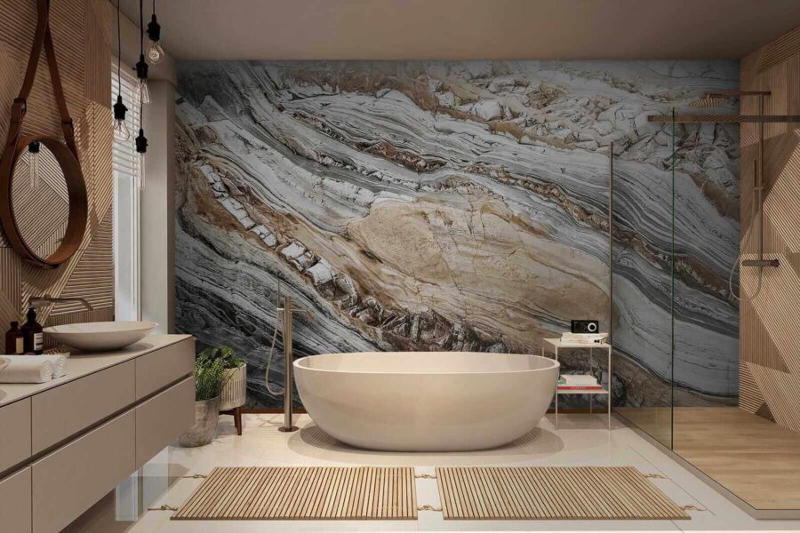 Imaginați-vă acest lucru: intrați în camera dvs. de zi și BAM – iată-l, un spectacol fascinant de straturi de roci naturale în tonuri liniștitoare de pământ. Această pictură murală este ca arta naturii, aducând o vibrație pământeană în spațiul tău. Are un efect 3D incredibil – aproape că simți că ai putea să atingi aceste texturi marmorate.