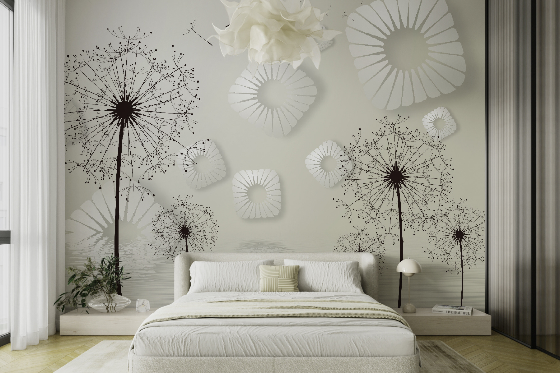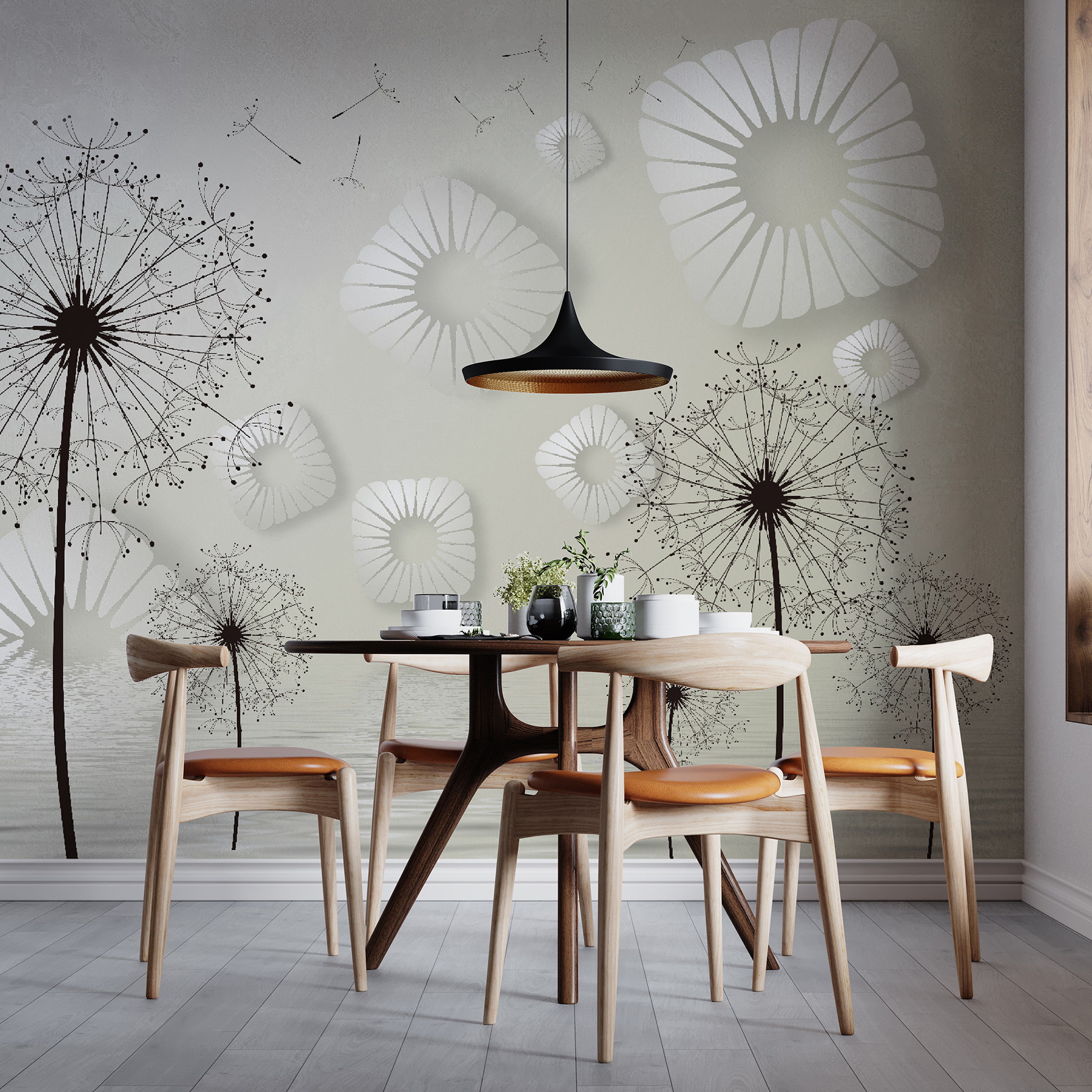 Transformarea unui spațiu poate părea magică, iar această pictură murală surprinde perfect această vibrație. Imaginați-vă că pășiți într-o cameră pictată cu păpădii delicate, ale căror forme fermecătoare și rarefiate invită la visare cu ochii deschiși și la fantezie. Desenele circulare albe plutesc precum norii, adăugând o notă ușoară și aerisită, proaspătă și primitoare.