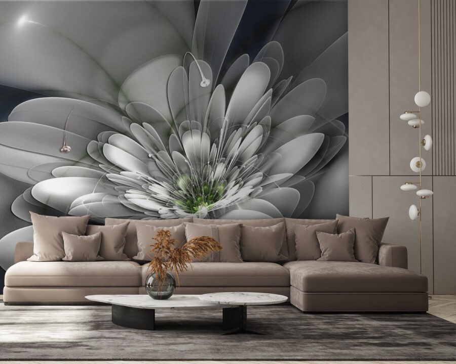 Imaginați-vă că pășiți într-o cameră care pare instantaneu mai ușoară, ca o gură de aer proaspăt. Această pictură murală, care prezintă o floare albă izbitoare cu un centru verde vibrant, este perfectă. Nuanțele sale blânde și curbele grațioase invită la un sentiment de calm și seninătate, perfect pentru un colț confortabil sau o zonă de living plină de viață.