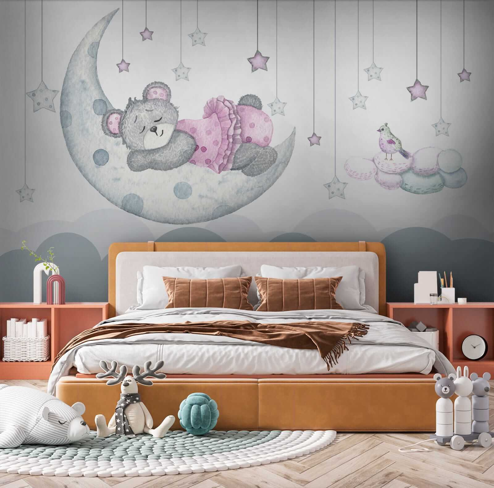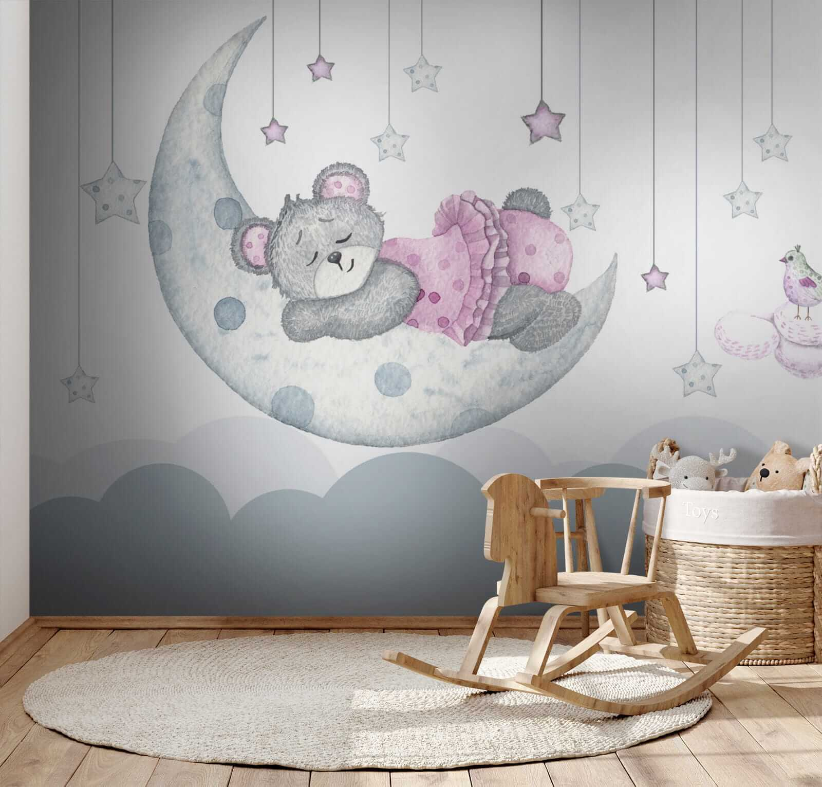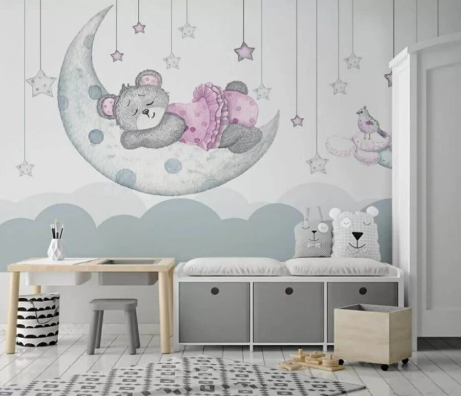 Imaginați-vă un ursuleț de pluș într-o rochie roz, dormind liniștit pe lună – sună visător, nu-i așa? Această pictură murală în acuarelă este perfectă pentru a adăuga un strop de magie în camera oricărui copil. Este moale și capricioasă, cu culori pastelate blânde care creează o atmosferă liniștitoare… perfectă pentru povești înainte de culcare și vise plăcute! Imaginați-vă expresia de pe fața micuțului dvs. când își va vedea noul cel mai bun prieten pe perete. În plus, este un fundal minunat pentru fotografii distractive. Ah, vibrații confortabile și scântei creative – această pictură murală le aduce pe amândouă!