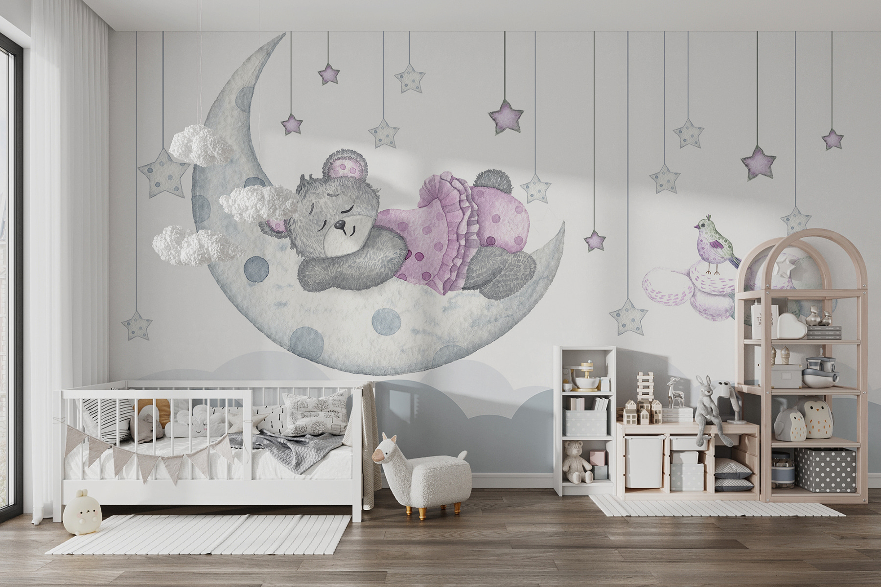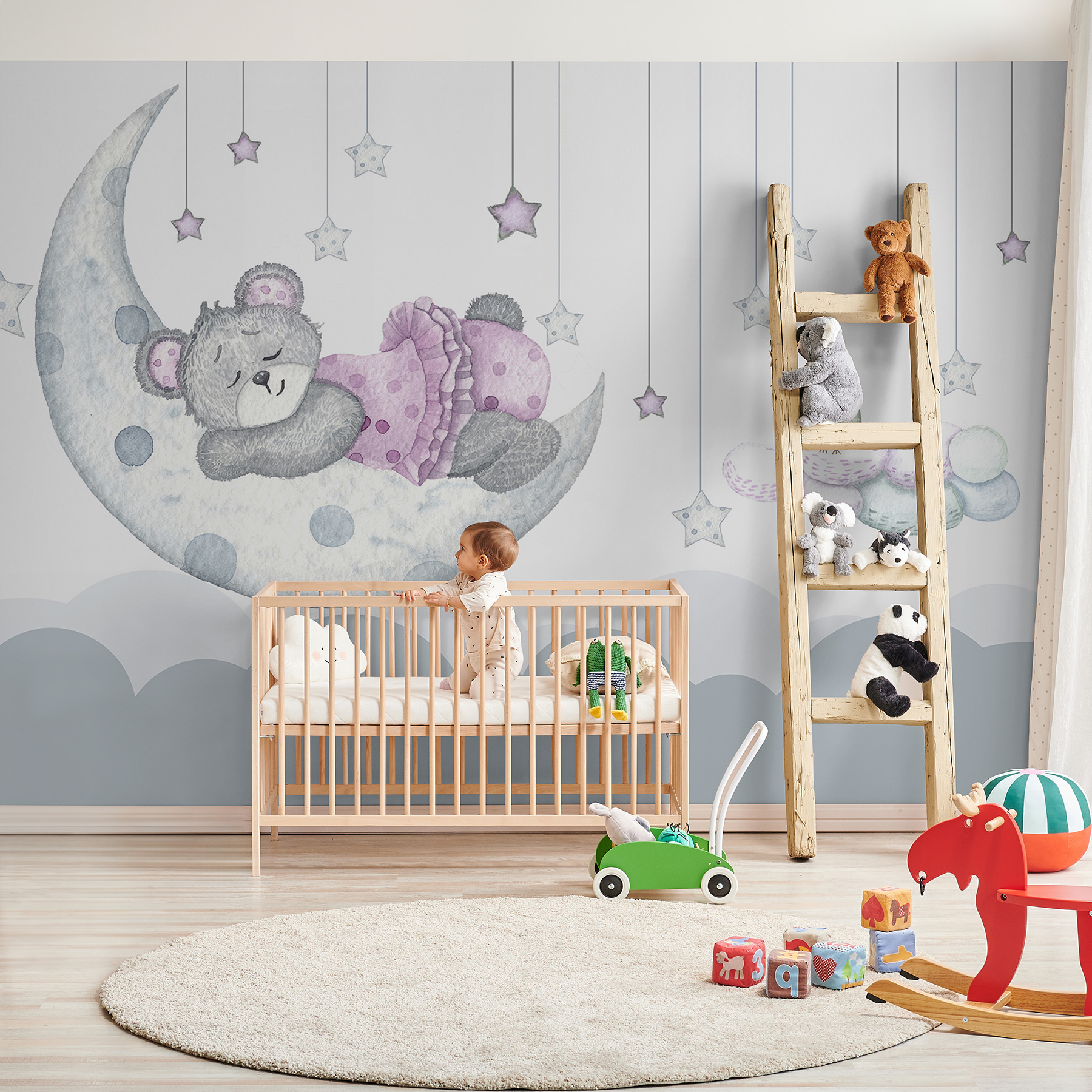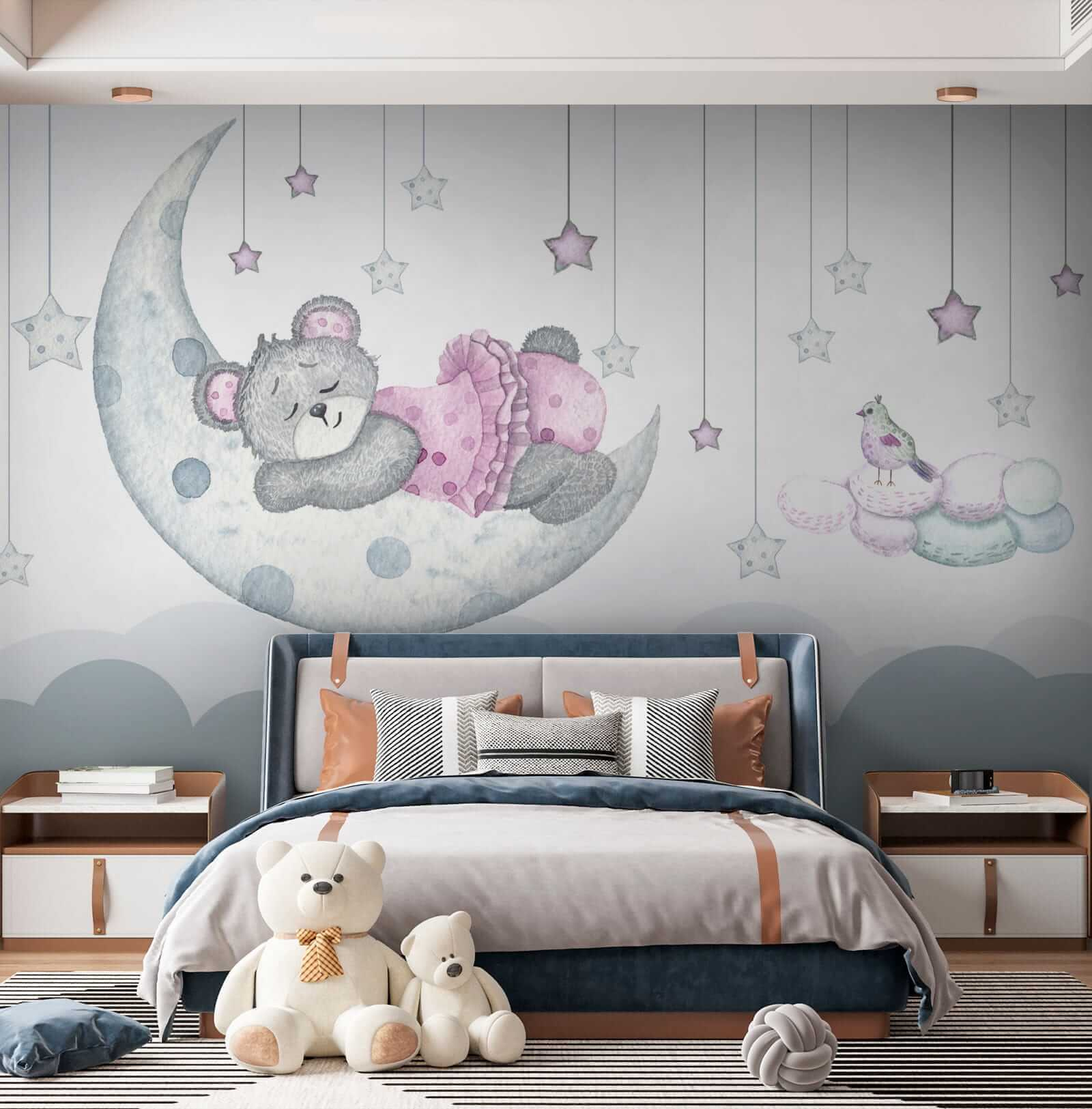 Imaginați-vă un ursuleț de pluș într-o rochie roz, dormind liniștit pe lună – sună visător, nu-i așa? Această pictură murală în acuarelă este perfectă pentru a adăuga un strop de magie în camera oricărui copil. Este moale și capricioasă, cu culori pastelate blânde care creează o atmosferă liniștitoare… perfectă pentru povești înainte de culcare și vise plăcute! Imaginați-vă expresia de pe fața micuțului dvs. când își va vedea noul cel mai bun prieten pe perete. În plus, este un fundal minunat pentru fotografii distractive. Ah, vibrații confortabile și scântei creative – această pictură murală le aduce pe amândouă!