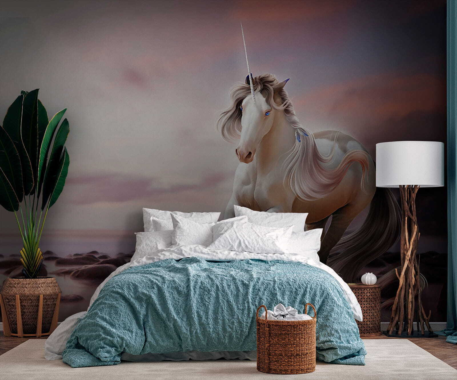 Imaginați-vă că pășiți într-o lume magică de fiecare dată când intrați în camera dvs. Acest perete mural “Unicorn mistic în apus de soare senin” face exact asta. Perfectă pentru oricine a visat vreodată să aibă un unicorn drept cel mai bun prieten, este ca și cum ai avea o bucată de tărâm fantastic chiar la tine acasă. Nuanțele blânde ale amurgului și liniștea mării surprind calmul unei seri la malul mării, dar cu un strop de magie – pentru că cine nu are nevoie de puțină încântare în viața sa? Este deosebit de potrivită pentru spațiile destinate copiilor sau ca o atingere capricioasă într-un colț de lectură. Imaginează-ți asta: stând întins pe pat, privind acest unicorn de vis, simțindu-te transportat într-un loc în care totul este posibil – asta face această pictură murală. Așadar, de ce să nu adăugați un strop de praf de zână decorului dvs. și să faceți ca fiecare zi să fie un pic mai magică?