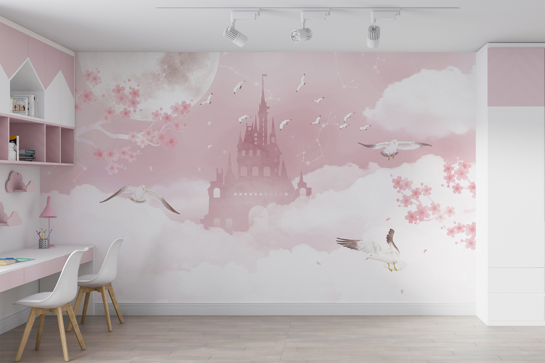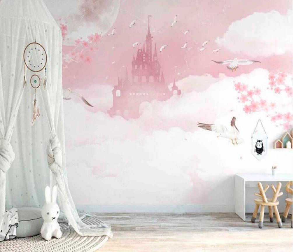 Imaginați-vă o fetiță întinsă în pat, care privește această pictură murală și se pierde într-o lume în care poate zbura cu păsările sau poate explora castele ascunse. Culorile pașnice și elementele fermecătoare creează un spațiu atât de liniștitor și imaginativ. Nu este doar o pictură murală – este o aventură care începe de fiecare dată când fetița intră în camera ei!