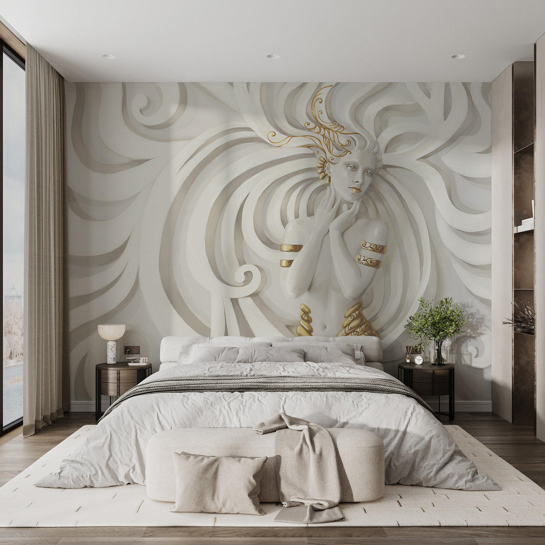 Transformați orice spațiu cu această pictură murală uimitoare care prezintă o figură elegantă învăluită în modele învolburate. Este ca și cum ați păși într-un vis în care arta întâlnește seninătatea. Imaginați-vă că primiți prieteni și îi vedeți cum le cad făcliile când văd această piesă – cu siguranță va stârni conversații. Modul în care curbele dansează în jurul figurii te atrage, invitându-te la un moment de pauză. Perfectă pentru un colț de lectură confortabil sau pentru un perete în camera de zi, aceasta adaugă un farmec unic și o notă de fantezie oricărei zone. Cine ar fi crezut că arta poate fi o astfel de vibrație?
