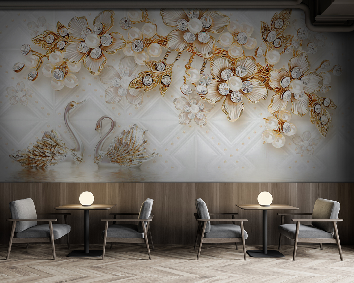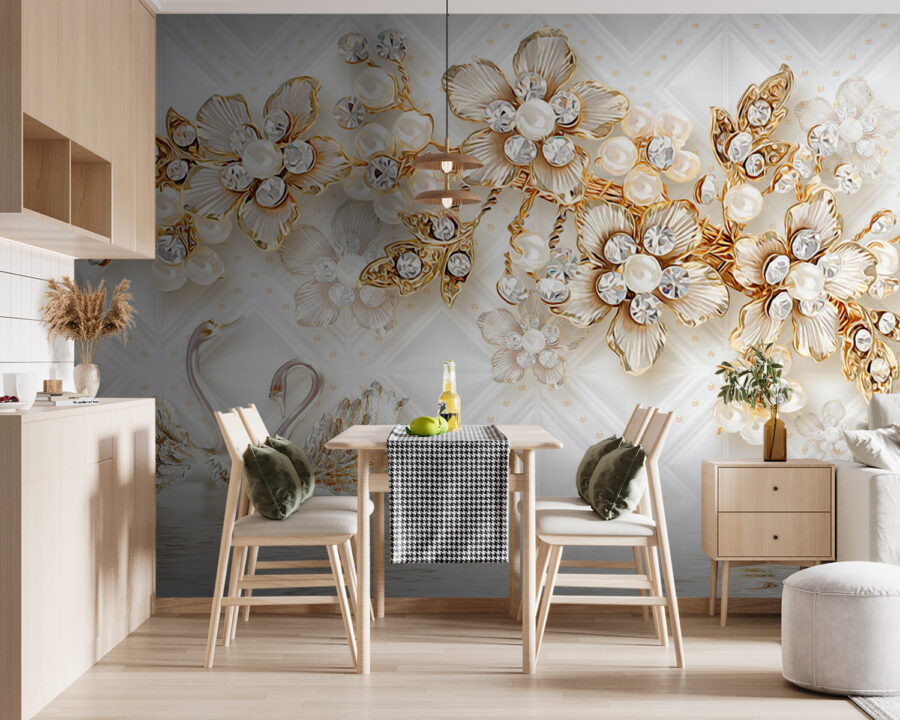 Transformați un perete plictisitor într-o operă de artă uimitoare cu această pictură murală încântătoare cu lebede elegante și flori delicate. Imaginați-vă că pășiți în fiecare zi într-un spațiu senin, în care aceste creaturi grațioase alunecă în mijlocul unui tărâm al minunilor floral. Este ca și cum ai avea o bucată de natură chiar în casa ta, șoptindu-ți povești de liniște și frumusețe. Imaginați-vă cafeaua de dimineață înconjurată de flori sau discuțiile de seară pe acest fundal de vis. Perfect pentru cei care apreciază un amestec de rafinament și farmec – la fel ca găsirea ținutei perfecte care să vă semene! Fie că este vorba de un colț confortabil sau de un living plin de viață, această pictură murală adaugă o notă de magie oricărui spațiu. Cine nu și-ar dori să se trezească în fața unei asemenea frumuseți?