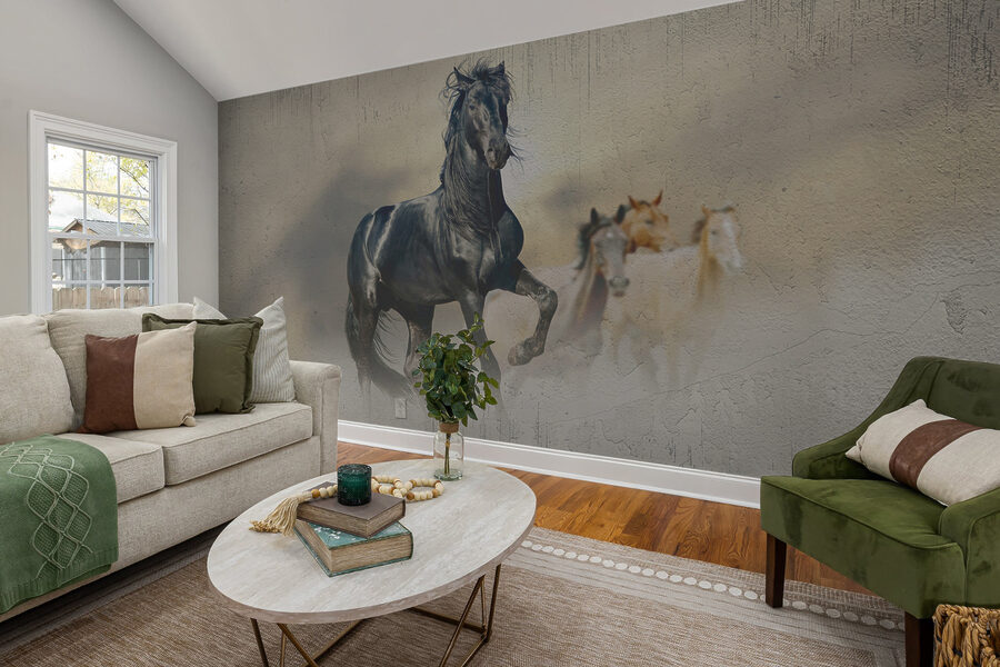 Transformați-vă spațiul cu această pictură murală impresionantă, care înfățișează un cal negru maiestuos, cu o coamă fluidă, care galopează ca și cum ar fi auzit cea mai bună veste. Imaginați-vă că intrați într-o cameră în care această frumusețe stă mândră, aproape invitându-vă să-l însoțiți într-o aventură sălbatică. Nu este doar decor; este o experiență. Tonurile calde, pământii creează o atmosferă confortabilă, dar vibrantă, ceea ce o face perfectă pentru o cameră de zi sau un birou. Prietenii se vor uita de două ori și poate chiar vor întreba dacă calul vine să vă salute. Perfect pentru iubitorii de animale sau pentru oricine se bucură de o atingere a spiritului neîmblânzit în casa lor. Caii aduc un sentiment de libertate, nu-i așa? Așa că de ce să nu-l lăsați pe acesta să vă inspire zilnic? Perfect pentru a adăuga caracter și căldură, acesta va deveni cu siguranță subiect de discuție în cameră.