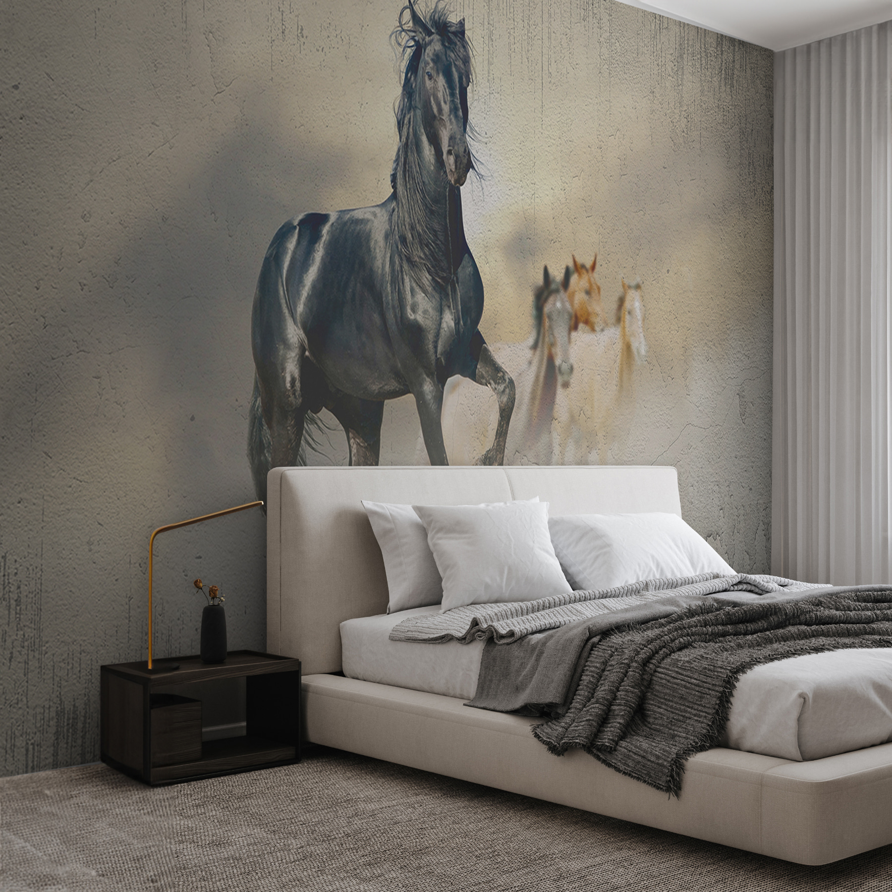 Transformați-vă spațiul cu această pictură murală impresionantă, care înfățișează un cal negru maiestuos, cu o coamă fluidă, care galopează ca și cum ar fi auzit cea mai bună veste. Imaginați-vă că intrați într-o cameră în care această frumusețe stă mândră, aproape invitându-vă să-l însoțiți într-o aventură sălbatică. Nu este doar decor; este o experiență. Tonurile calde, pământii creează o atmosferă confortabilă, dar vibrantă, ceea ce o face perfectă pentru o cameră de zi sau un birou. Prietenii se vor uita de două ori și poate chiar vor întreba dacă calul vine să vă salute. Perfect pentru iubitorii de animale sau pentru oricine se bucură de o atingere a spiritului neîmblânzit în casa lor. Caii aduc un sentiment de libertate, nu-i așa? Așa că de ce să nu-l lăsați pe acesta să vă inspire zilnic? Perfect pentru a adăuga caracter și căldură, acesta va deveni cu siguranță subiect de discuție în cameră.