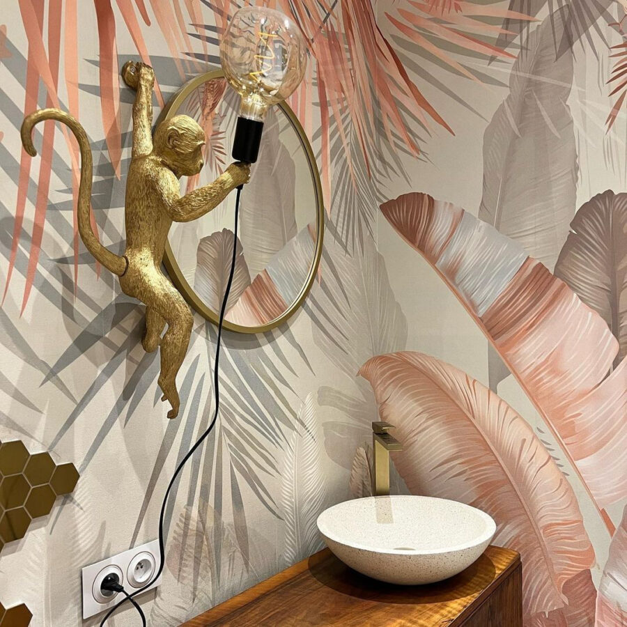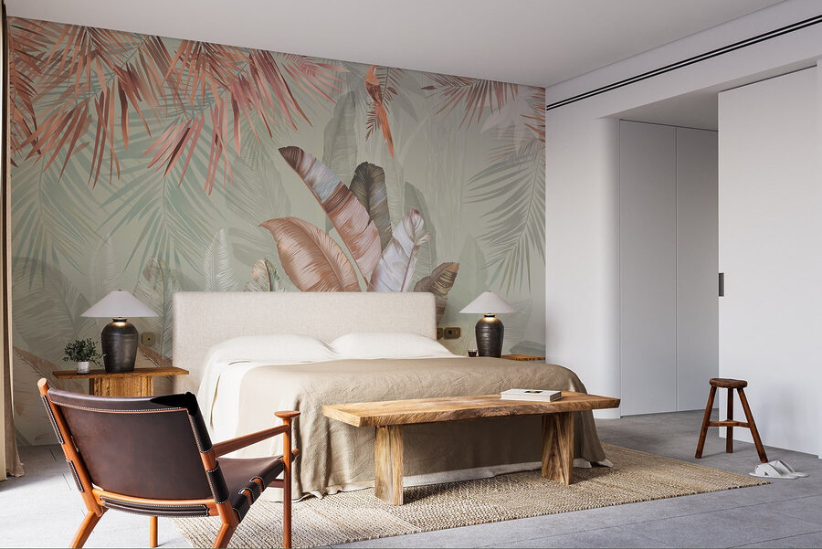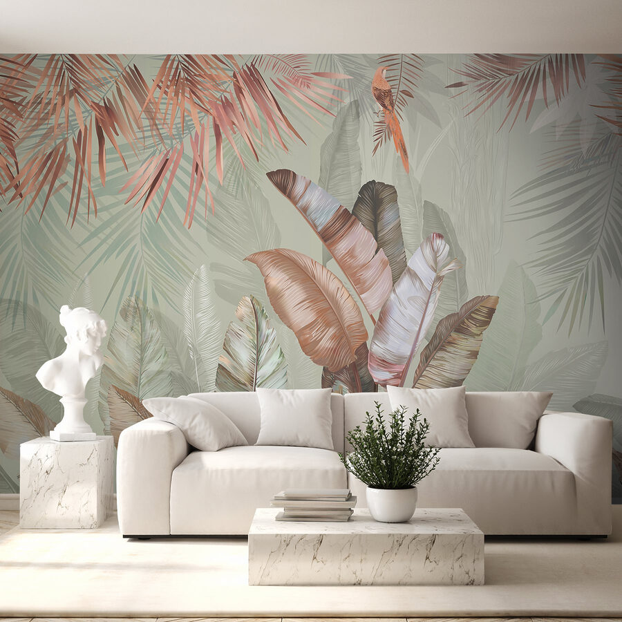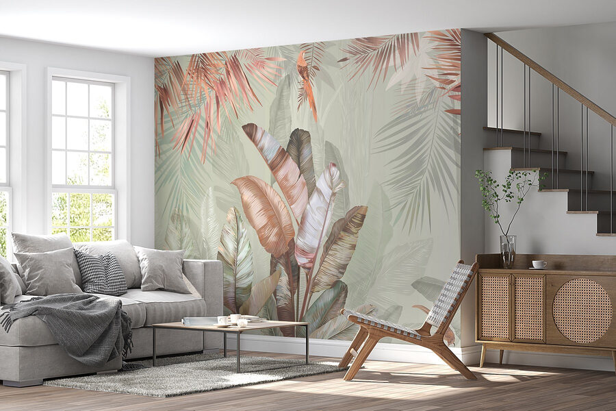 Transformați-vă spațiul cu această pictură murală încântătoare cu frunze tropicale în nuanțe pastelate moi. Imaginați-vă acest lucru: trezirea într-o cameră luminată de soare în care natura șoptește prin artă. Aceste tonuri blânde de verde și fard de obraz invită la o atmosferă calmă, perfectă pentru un colț confortabil sau chiar pentru o cameră de zi luminoasă. Imaginați-vă sorbind cafeaua într-o zi ploioasă, simțindu-vă ca și cum ați lenevi într-o junglă senină. Este ca o mini-vacanță chiar pe peretele tău. În plus, este o sursă excelentă de conversație – oaspeții vor fi curioși să afle care este inspirația din spatele acestei frumuseți liniștitoare.