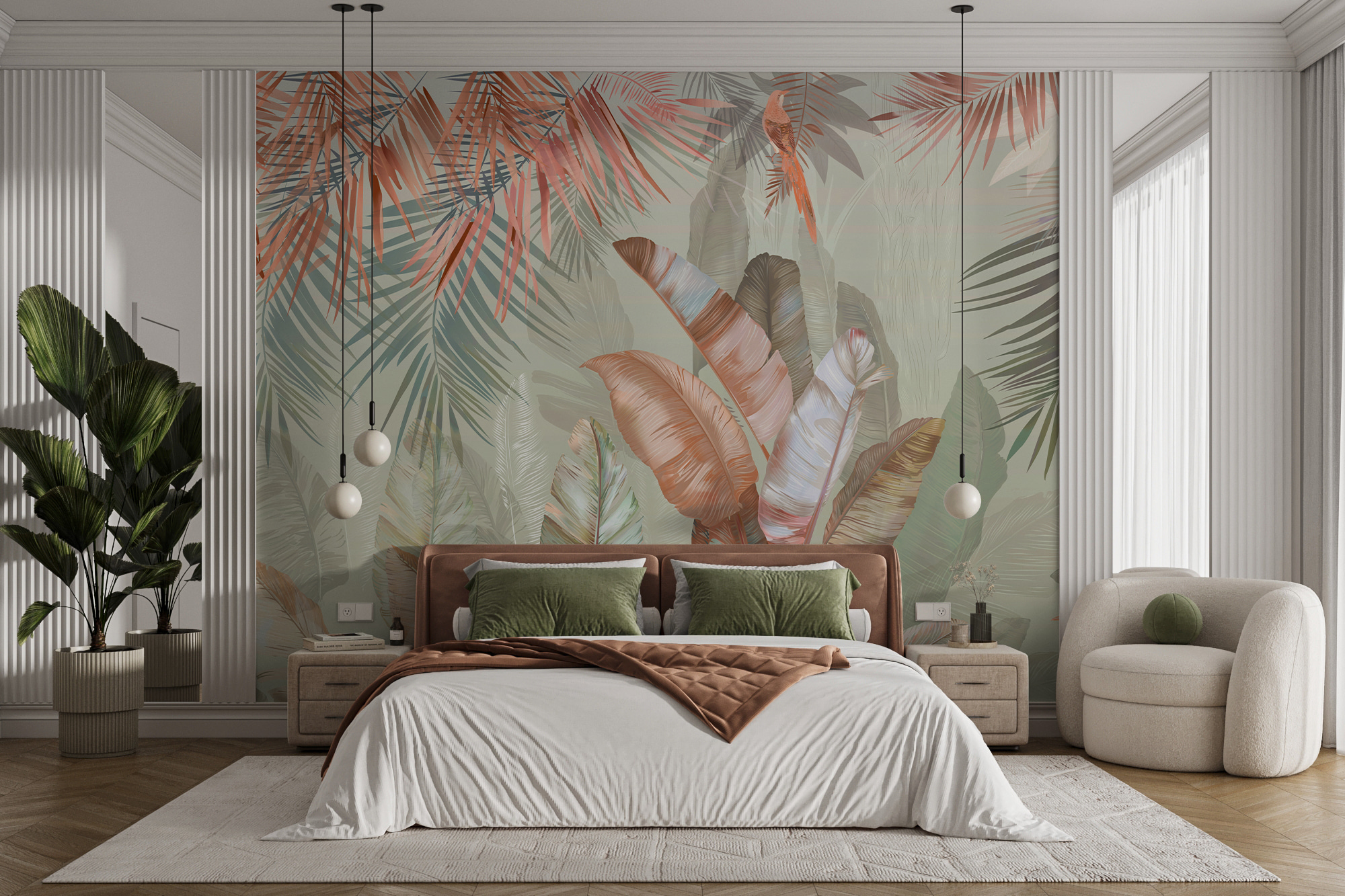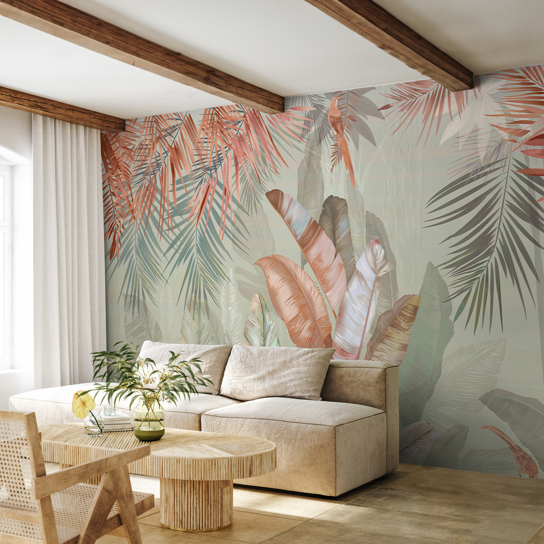 Transformați-vă spațiul cu această pictură murală încântătoare cu frunze tropicale în nuanțe pastelate moi. Imaginați-vă acest lucru: trezirea într-o cameră luminată de soare în care natura șoptește prin artă. Aceste tonuri blânde de verde și fard de obraz invită la o atmosferă calmă, perfectă pentru un colț confortabil sau chiar pentru o cameră de zi luminoasă. Imaginați-vă sorbind cafeaua într-o zi ploioasă, simțindu-vă ca și cum ați lenevi într-o junglă senină. Este ca o mini-vacanță chiar pe peretele tău. În plus, este o sursă excelentă de conversație – oaspeții vor fi curioși să afle care este inspirația din spatele acestei frumuseți liniștitoare.