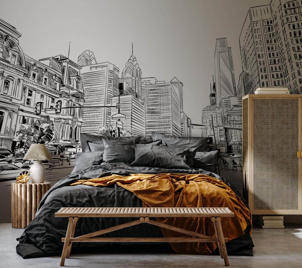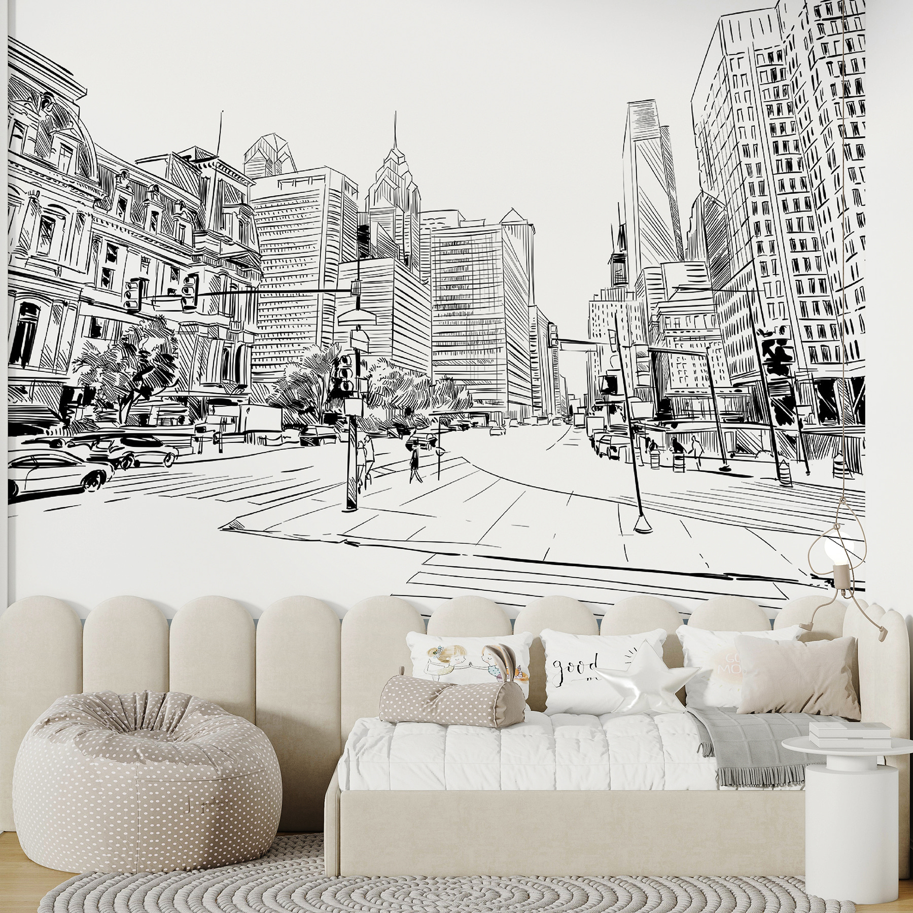 Bună ziua! Uită-te la această frescă murală – este o schiță alb-negru a unui peisaj urban care pare desprinsă dintr-un roman grafic. Îți poți imagina cum ar fi să te trezești cu așa ceva? Este ca și cum ai avea un oraș plin de viață chiar în sufrageria ta, fără zgomot și aglomerație. Perfect pentru a adăuga ceva urban chic spațiului tău, nu-i așa?