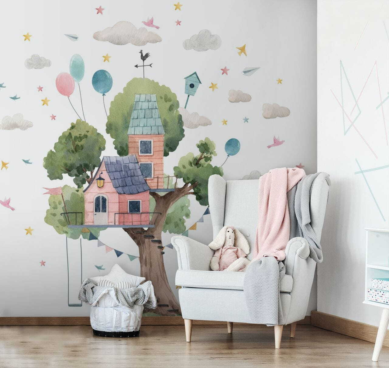 Imaginați-vă o căsuță în copac capricioasă, plutind într-o lume de vis pictată în acuarelă. Acest mural nu este doar o imagine, ci o invitație la aventură! Aduce esența copilăriei în orice cameră, fiind perfectă pentru a stimula imaginația. Culorile pastelate, baloanele jucăușe și păsările fermecătoare ar putea readuce pe oricine în acele zile fără griji, în care se urca în copaci și se visa cu ochii deschiși. Imaginați-vă un colț confortabil, unde imaginația zboară liberă, iar copiii chicotesc la petreceri imaginare cu ceai în vârful copacilor. Acest mural ar putea fi cu ușurință piesa centrală a unui spațiu magic, oferind bucurie și uimire pentru mulți ani de acum înainte!