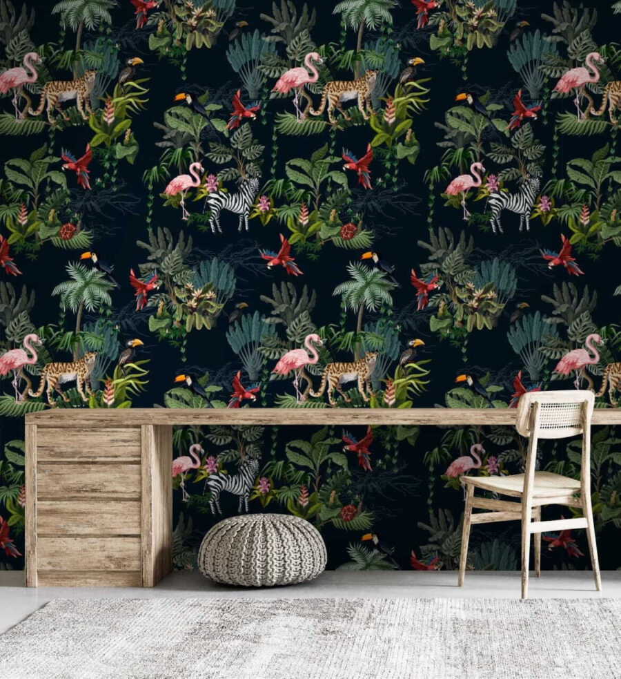 Transformați orice perete într-o evadare vibrantă cu acest mural uimitor, cu flamingo și zebre în mijlocul vegetației tropicale luxuriante. Este ca și cum ați aduce o bucățică din sălbăticie direct în sufrageria dvs. – sau în baie, dacă vă simțiți îndrăzneț! Imaginați-vă că pășiți într-o junglă luxuriantă de fiecare dată când treceți pe lângă ea. Culorile bogate ies în evidență pe un fundal mai întunecat, făcându-l fundalul perfect pentru întâlniri confortabile sau relaxare în singurătate. În plus, este un excelent subiect de conversație – cui nu-i place să discute despre fauna exotică? Acest mural nu este doar un element decorativ, ci o experiență. Așadar, îmbunătățiți acel perete simplu și lăsați vibrațiile junglei să curgă!
