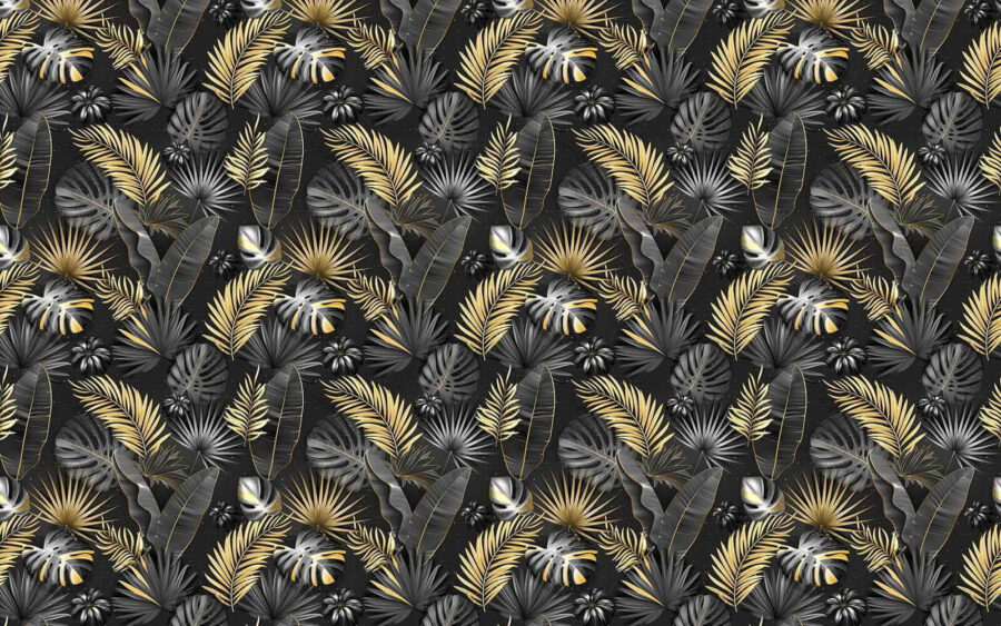 Transformați orice cameră într-o oază luxuriantă cu acest mural elegant cu frunze tropicale. Imaginați-vă că pășiți într-o junglă senină – modelele bogate și frunzișul îndrăzneț creează o atmosferă captivantă și liniștitoare. Fundalul negru izbitor face ca frunzele vibrante să iasă în evidență ca și cum ar saluta.